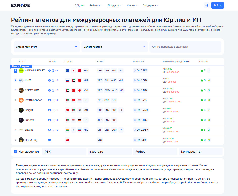 - Выбор платежного агента. Перед тем как начать перевод, посмотрите доступные сервисы, сравните условия, тарифы и отзывы клиентов. Для этого можно использовать сайт-мониторинг Exnode, где можно сравнить платежных агентов. После этого подпишите договор с выбранным агентом.