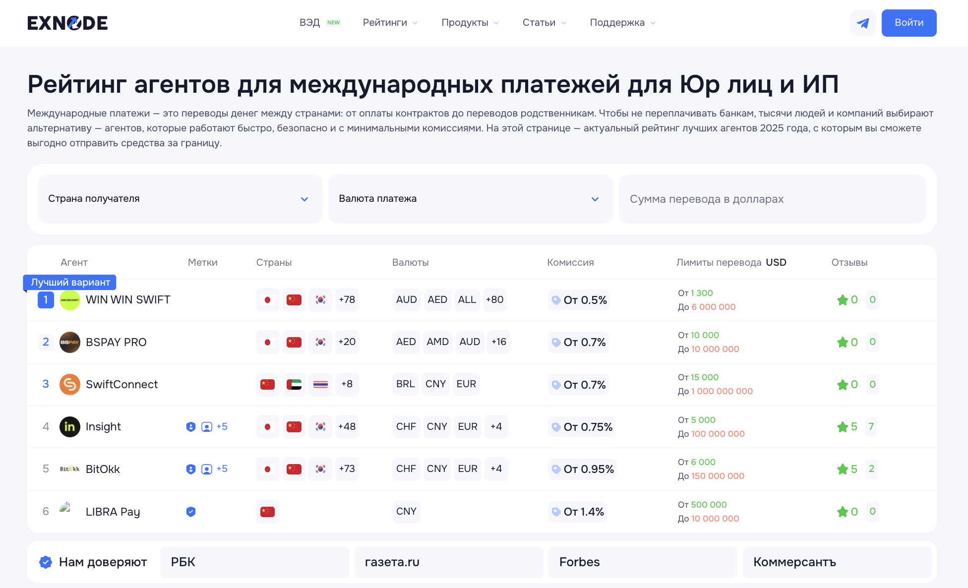 В таких условиях на первый план выходят платформы международных платежей — финтех-решения, которые позволяют безопасно и официально проводить переводы за границу, минуя банковские барьеры. На платформе Exnode можно найти проверенных платёжных агентов, которые работают с Юр лицами, ИП и даже физлицами. Это особенно актуально для тех, кто хочет оплатить инвойс зарубежному поставщику без лишних рисков. Далее разберём, какие есть альтернативы классическим банковским swift переводам, как работают современные платёжные платформы, в чём их преимущества и как безопасно перевести деньги в 2025 году. Когда банковский swift перевод из России больше не даёт гарантии скорости, стабильности и даже самого факта зачисления, компании всё чаще обращаются к специализированным платформам международных платежей. Эти сервисы позволяют легально и быстро оплачивать инвойсы за границу, в том числе в Китай, Европу, ОАЭ и другие страны. В отличие от банков, они работают прозрачно, заключают агентские договоры и выдают полный комплект документов — акт и приложение к договору, что особенно важно при проверках и налоговой отчётности. На платформе собраны надёжные платёжные агенты, с которыми можно работать напрямую: подобрать страну, валюту, способ оплаты и быстро провести платёж даже в обход банковских ограничений. Ниже — три ключевых сервиса, которые помогают провести перевод через swift и подойдут как для ИП, так и юридических лиц, оплачивающих товары или услуги за рубежом. Insight Платформа Insight — универсальный инструмент для международных расчётов в разных юрисдикциях. Он особенно актуален, когда необходимо провести swift перевод в Китай, Европу или на Ближний Восток. Insight ориентирован на гибкость: клиент получает индивидуальные условия, возможность оплатить в нужной валюте, поддержку в документации и подробную консультацию. Это надёжный выбор для тех, кто сталкивается с отказами банков и хочет обойти ограничения без нарушения законодательства. Преимущества платформы Insight: Win Win Swift Win Win Swift — это сервис, сфокусированный на оперативной оплате инвойсов за границу с использованием классической системы переводов SWIFT. Сервис особенно удобен для бизнеса, работающего с Китаем, Турцией, странами СНГ и Азии. Платформа берёт на себя весь цикл расчёта — от заключения договора до перевода поставщику, при этом действует строго в рамках законодательства. Преимущества Win Win Swift: BitOkk BitOkk — один из немногих сервисов, которые активно работают с азиатским направлением, включая swift переводы в Китай. Платформа предлагает гибкую настройку перевода, в том числе возможность использования криптовалютного шлюза при необходимости. Это удобно для тех, кто закупает товары, комплектующие или оборудование в Китае и хочет избежать проблем с банковскими переводами. BitOkk выстраивает схему через международных партнёров, а все расчёты внутри России проводятся в рублях, что избавляет клиента от валютного контроля. Преимущества BitOkk: Каждый из этих сервисов помогает заменить устаревший и неудобный банковский перевод SWIFT, предлагая бизнесу и частным клиентам реальные альтернативы. В отличие от банков, они не зависят от цепочек корреспондентов, работают напрямую с получателем и способны проводить swift переводы из России. Если вы планируете оплату инвойса за рубеж, но не хотите сталкиваться с 