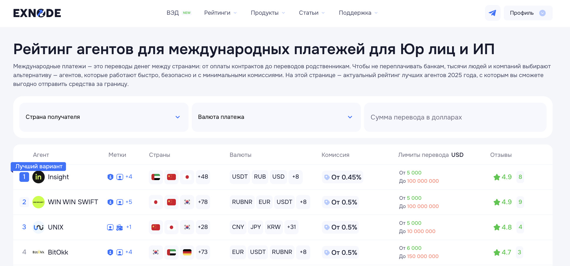 Сегодня существует два основных способа перевода средств за рубеж: традиционные банковские переводы и платформы международных платежей. Последние — это современные финтех-решения, которые позволяют проводить расчёты быстро, с минимальной комиссией и документальным сопровождением. Найти надёжных платёжных агентов можно с помощью мониторинга Exnode — сервиса, который собирает актуальную информацию по комиссиям, валютам, странам и условиям работы платформ международных платежей. После того как а7 агент оказался под санкциями ЕС, многим компаниям могло потребоваться оперативно найти другие платформы для международных переводов. Но для этого важно не только сохранить стабильность расчётов с зарубежными партнёрами, но и продолжать работать в рамках закона. Особенно актуально это для малого и среднего бизнеса, работающего по инвойсам с Китаем, ОАЭ, Турцией и другими странами. В таких условиях внимание предпринимателей может сместиться в сторону других платёжных агентов — тех, кто уже доказал свою устойчивость, обеспечивает скорость, понятные комиссии и выдаёт все необходимые документы, включая акт и приложение к агентскому договору. Ниже — обзор трёх платформ, которые сегодня можно рассматривать как полноценную замену а7 платежного агента. Insight — универсальный платёжный агент, который подойдёт для тех, кто впервые сталкивается с оплатой зарубежного инвойса. Сервис работает через собственные юрлица в РФ и за рубежом, благодаря чему предлагает безопасную схему оплаты в рублях с выводом в иностранную валюту. Компания Insight активно используется для оплат товаров из Китая, ОАЭ, ЕС, а также в более специфичных направлениях. Комиссия от 0.9%, все расчёты прозрачны, клиент получает акт и приложение к агентскому договору. Удобна тем, что предлагает индивидуальные условия под разные суммы и типы товаров. Преимущества: Win Win Swift — один из самых популярных платёжных агентов, который подходит как для малого бизнеса, так и для крупных поставок. Эта платформа работает с рублёвым входом и зарубежным выходом в различных валютах, включая USD, CNY, AED и EUR. Пользователям доступна прозрачная модель расчётов с комиссией от 0.9%, без скрытых платежей. Агент оформляет акт и приложение к агентскому договору. Среди направлений — Турция, ОАЭ, Китай, Европа. Это универсальное решение, которое закрывает большую часть потребностей в ВЭД-платежах. Преимущества: BitOkk — платёжная платформа с акцентом на гибкие расчётные схемы и быструю работу с инвойсами. Подходит для компаний, которые работают на регулярной основе с Китаем, Гонконгом, ОАЭ и другими экспортно-ориентированными странами. Комиссия стартует от 0.9%, курс обсуждается заранее и закрепляется в момент сделки. В структуре BitOkk предусмотрены как российские, так и зарубежные юрлица, благодаря чему платформа обеспечивает законную схему перевода. Обязательным элементом является акт и приложение к агентскому договору. Преимущества: Если вы ранее работали с а7 агент и теперь ищете надёжную альтернативу, эти три платформы — Win Win, BitOkk и Insight — могут стать безопасным и эффективным решением. А7 агент — это платёжная платформа, которая предоставляет услуги по проведению международных переводов из России. До введения ограничений а7 платёжный агент активно использовался предпринимателями и компаниями для оплаты и