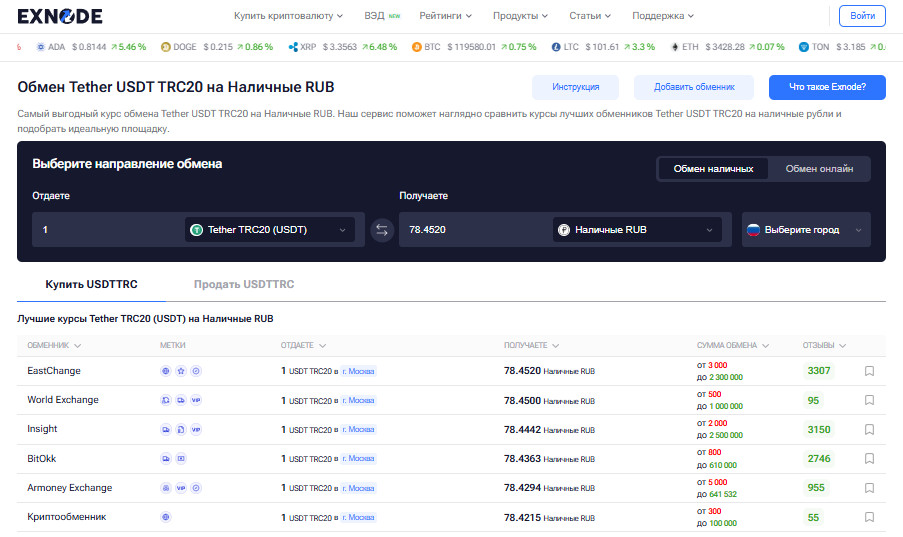 Но как отличить надежный сервис от сомнительной конторы? Где найти топ обменников криптовалют, гарантирующих честные условия и мгновенные операции? Ответ — в этом обзоре. Мы собрали криптообменники, которые заслужили доверие пользователей и подтвердили свою репутацию на независимых площадках, таких как Exnode — сервисе, где каждый может проверить отзывы и реальный рейтинг обменных пунктов.
