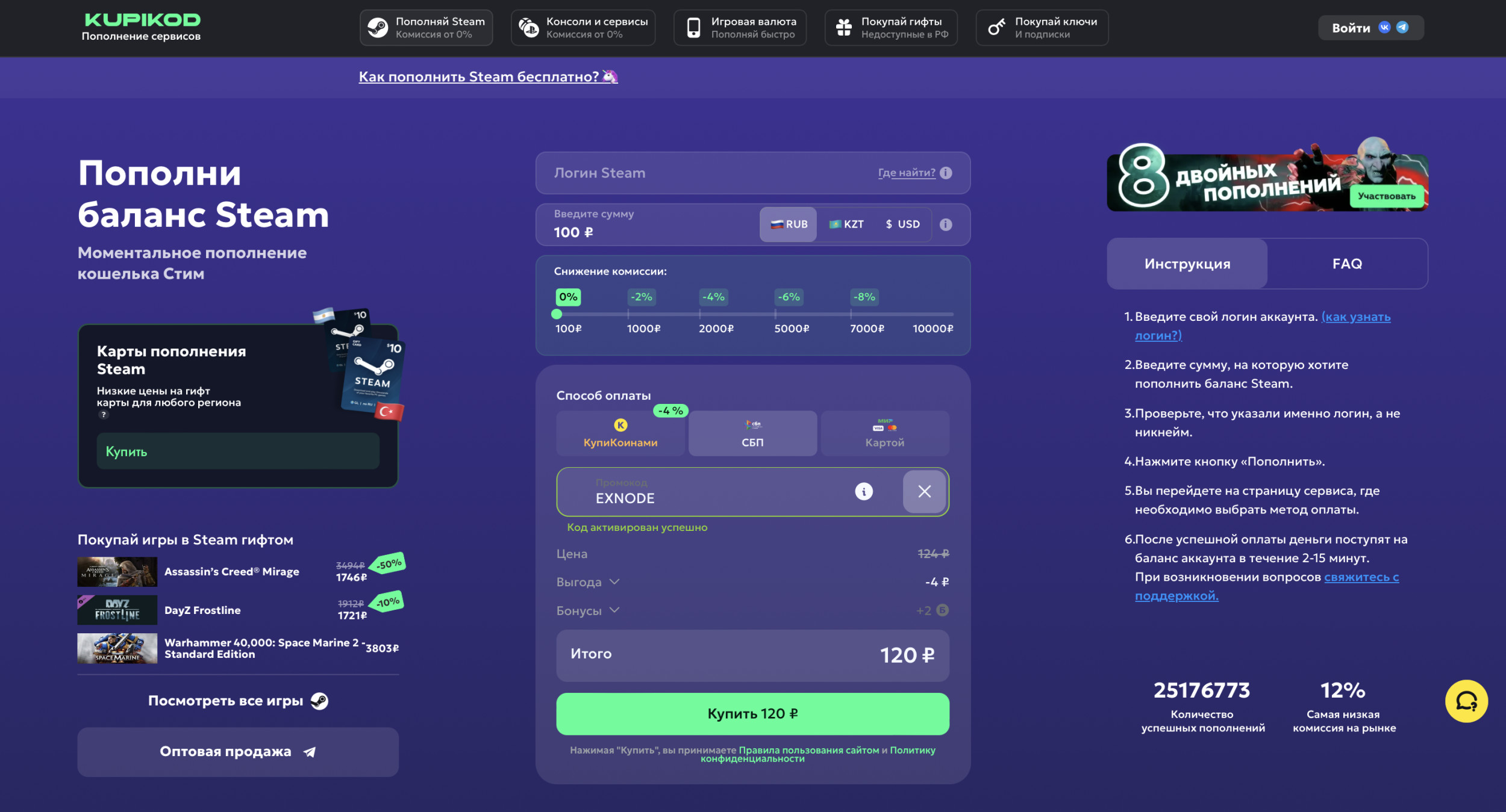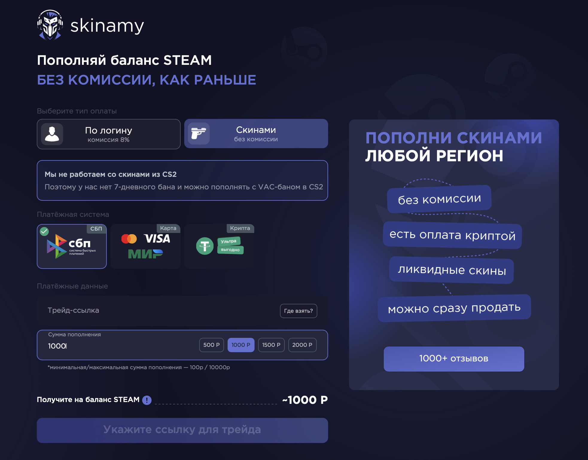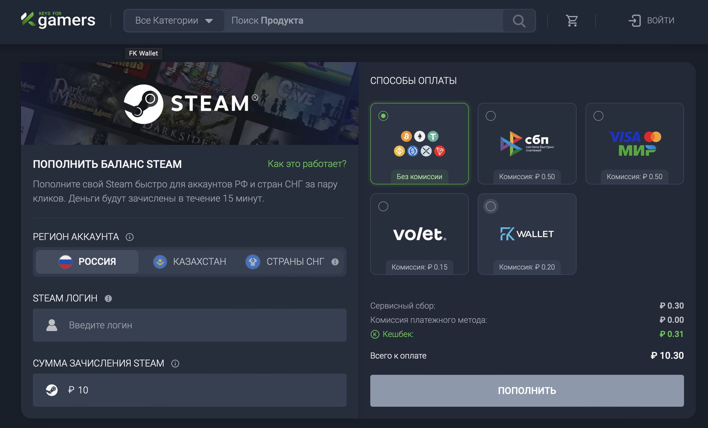 - Низкая комиссия делает пополнение Стим экономичным.