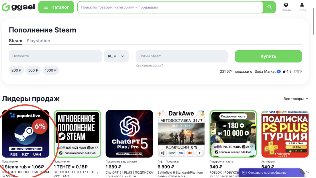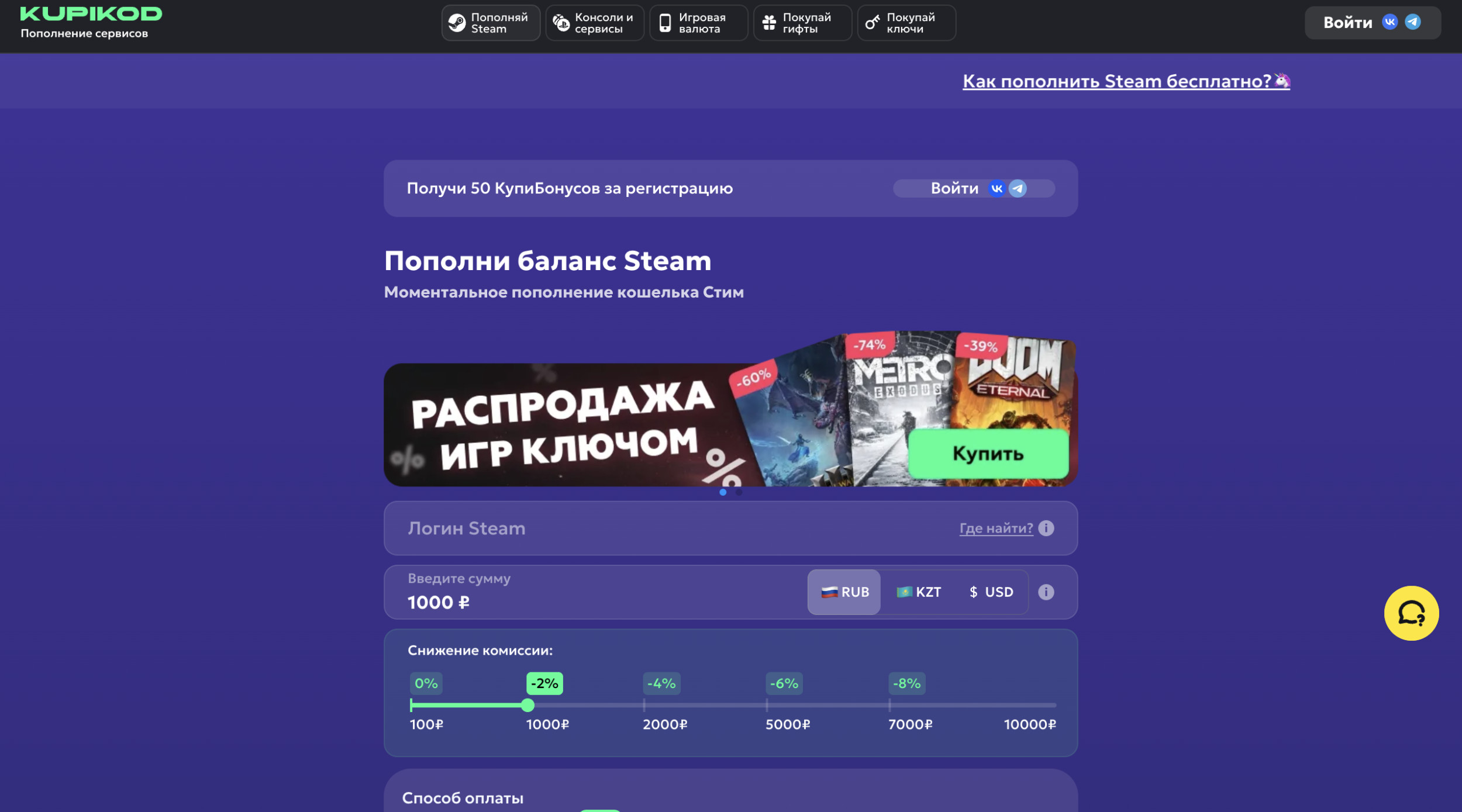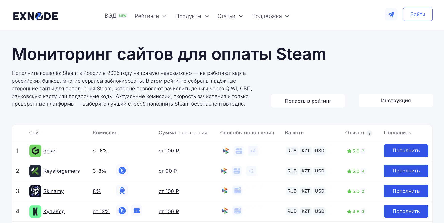 GGSEL — это крупнейший маркетплейс, где можно не только пополнить Стим тенге, но и приобрести игры, подписки и цифровые коды для разных платформ. Площадка работает как агрегатор продавцов, поэтому комиссия может немного отличаться, но при грамотном выборе продавца она начинается от 6%. Минимальная сумма пополнения составляет 100 рублей или эквивалент в тенге. Главный плюс сервиса — высокая скорость зачисления и широкий выбор способов оплаты: СБП, банковские карты, WebMoney, подарочные карты. Особенности GGSEL: Вывод: GGSEL подойдёт тем, кто хочет пополнить Стим аккаунт в тенге быстро и с минимальными потерями. Особенно выгодно при регулярных пополнениях небольших сумм. Keysforgamers Keysforgamers — это сервис, созданный специально для геймеров. Здесь можно пополнить кошелёк Стим через тенге, купить игровые ключи, валюту, донаты и даже профессиональный софт. Комиссия составляет около 8% при оплате картой или через СБП, но благодаря кэшбэку в 3% реальная комиссия снижается до 5%. Минимальная сумма пополнения составляет 100 рублей или эквивалент в тенге. Особенности Keysforgamers: Вывод: Keysforgamers особенно удобен тем, кто часто пополняет баланс Стим в тенге и хочет экономить на каждом платеже за счёт возврата бонусов. Skinamy Skinamy — это уникальная платформа, которая позволяет пополнить Стим через тенге как обычным способом, так и через скины. Именно схема с пополнением скинами делает сервис особенно привлекательным: комиссия может составлять 0%. При стандартной оплате картой комиссия около 8%, но при использовании скинов из Dota 2, Rust или TF2 (сервис не работает со скинами из CS2 из-за 7-дневной блокировки на торговлю), которые можно либо продать по моментальному ордеру с потерей до 5%, либо продать с нулевой потерей, или даже получить выгоду до 5%. Для этого нужно выставить скин на продажу по рыночной цене. Минимальная сумма пополнения — 100 рублей. Особенности Skinamy: Вывод: Skinamy выгоден тем, кто умеет работать со скинами и хочет пополнить баланс Стим казахскими тенге без комиссии. Это хороший вариант для опытных игроков. КупиКод КупиКод — это универсальная платформа, где можно пополнить Стим казахстан в тенге, а также приобрести игровые ключи, валюту и гифты. Комиссия варьируется от 24% до 16% в зависимости от суммы пополнения: чем больше сумма, тем меньше комиссия. Минимальная комиссия 16% доступна при пополнении от 7000 рублей, но благодаря системе бонусов её можно снизить еще больше. Действует кэшбэк 2,3% баллами, а при оплате бонусами — дополнительная скидка 4%. Также скидку в 4% можно получить с промокодом EXNODE. Минимальная комиссия при сочетании различных скидок может составить всего 12%. Особенности КупиКод: Вывод: КупиКод оптимален для тех, кто хочет пополнить Стим кошелёк в тенге на крупные суммы и при этом получить ощутимую скидку за счёт бонусов и промокода. Чтобы пополнить Стим тенге в 2025 году безопасно и без ошибок, достаточно придерживаться универсального алгоритма. Эта инструкция подходит для всех сервисов из ТОПа — GGSEL, Keysforgamers, Skinamy и КупиКод. Даже если вы впервые сталкиваетесь с подобной операцией, повторить шаги будет несложно. Шаг 1. Перейдите на мониторинг. Начните с перехода на мониторинг сервисов для пополнения Стим от Exnode. Здесь собраны проверенные сайты, указаны их комиссии, доступные валюты и способы оплаты. Это позволяет сразу сравнить условия и выбрать лучший вариант д