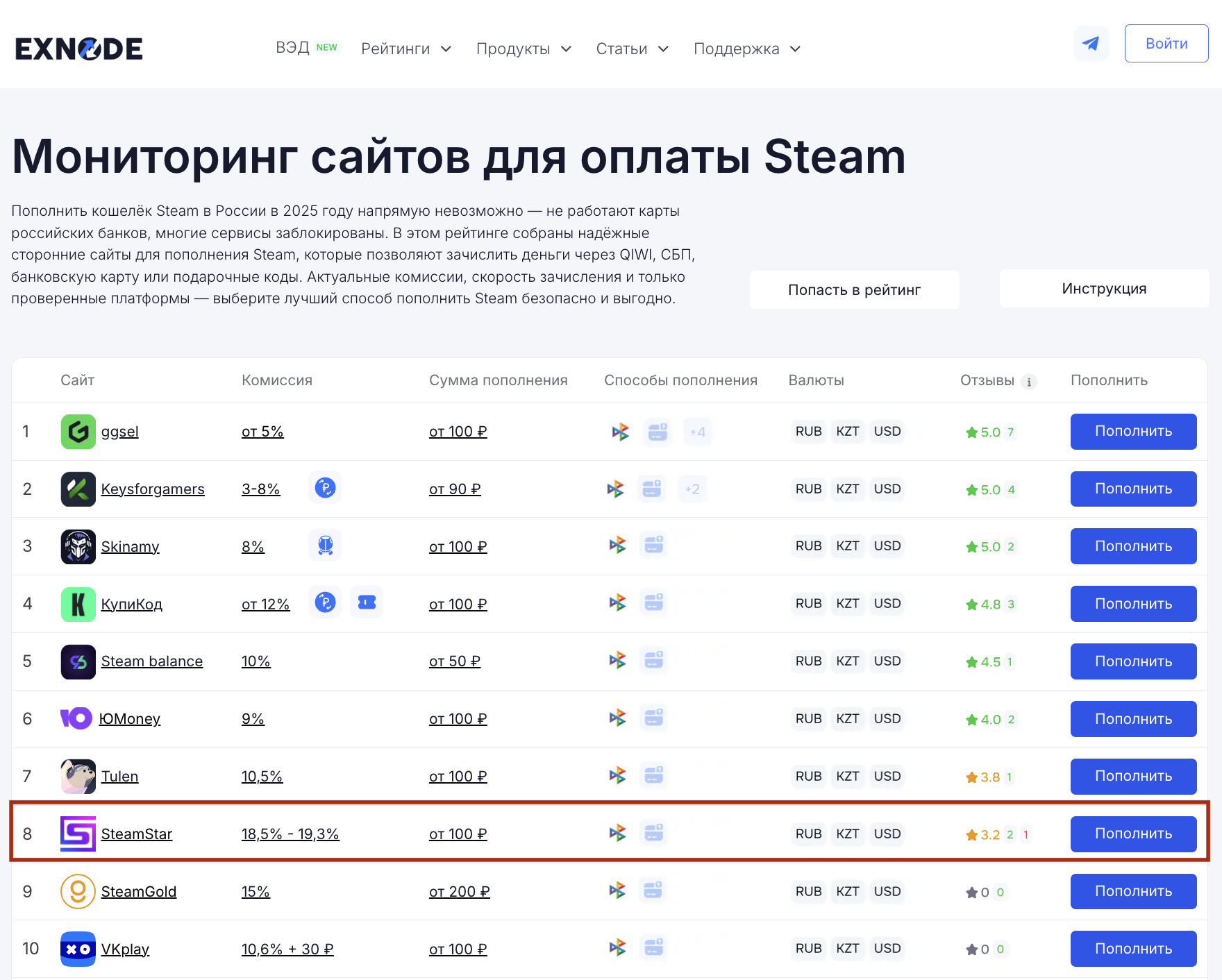 Чтобы разобраться, как работает Steamstar, какие есть варианты пополнения и что думают пользователи в отзывах, мы собрали подробное руководство. В нём также используем данные мониторинга Exnode, где представлен рейтинг сайтов для пополнения Стим — это помогает сравнить сервисы между собой и выбрать самый удобный вариант.