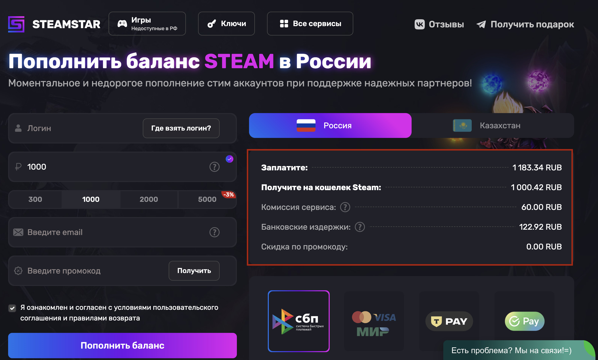 Стимстар — это онлайн-сервис, который позволяет быстро и безопасно пополнить баланс в Steam. В 2025 году такие сервисы стали одним из самых востребованных решений для геймеров, которым важно без задержек внести средства на счёт. Используя пополнение Steamstar, можно задонатить в любую игру, приобрести внутриигровые предметы или пополнить кошелёк. Фактически сайт Steamstar выступает посредником между пользователем и кошельком Steam: вы указываете логина, выбираете сумму, удобный способ оплаты, подтверждаете транзакцию и получаете средства на счёте. Благодаря такому формату пополнение Стим в Стимстар подходит как для небольших донатов, так и для крупных покупок. Пополнение Стим не требует специальных знаний. Даже если вы впервые сталкиваетесь с подобным способом доната, разобраться будет просто. Ниже приведена пошаговая инструкция, которая позволит без ошибок пройти весь процесс и зачислить средства на свой кошелёк. Дополнительно: покупка игры через Steamstar. Помимо стандартного пополнения, через сервис можно не только пополнить Стим в Стимстар, но и сразу приобрести нужную игру. Для этого выберите ключ, оплатите его так же, как баланс, и активируйте код в своём аккаунте. Сегодня у российских игроков есть несколько вариантов пополнить баланс Steam. Кто-то по-старинке пользуется банками или мобильными операторами, кто-то ищет ваучеры или просит знакомых за границей. Но всё чаще внимание привлекают сайты для автоматического пополнения. Рассмотрим основные методы и сравним их по ключевым параметрам — комиссиям, скорости, безопасности и доступности. Автоматическое пополнение через сайты Площадки вроде Steamstar (комиссия 18,5 — 19,3%), GGSEL (комиссия 6%), или Keysforgamers (комиссия 8% — 3% кэшбэк) позволяют напрямую пополнить баланс Стим по логину, минуя сложные схемы. Пользователь выбирает сумму, вводит данные и оплачивает удобным способом. Средства зачисляются почти моментально, а иногда можно использовать промокоды для снижения комиссии. Такой формат удобен тем, что не требует сторонних посредников — баланс обновляется быстро, а операции доступны в рублях, долларах и тенге. Пополнение через мобильных операторов Мобильные операторы предлагают возможность пополнить Стим со счёта телефона. Это выглядит удобно: деньги списываются с баланса сим-карты. Однако у такого метода есть ограничения: высокие комиссии (10-15 %), низкие лимиты на переводы и сложности с возвратом средств при ошибке. Подходит скорее для небольших донатов, но для регулярных пополнений этот способ заметно уступает по стоимости и гибкости. Пополнение через банки Некоторые банки предлагают специальные сервисы для донатов и пополнения кошелька Steam. Обычно процесс напоминает классический онлайн-платёж: карта или перевод через интернет-банк. Преимущество — привычность и формальная надёжность. Минусы — комиссии, возможные задержки при прохождении платежа, а также ограничения на валютные операции. Для крупных сумм такой вариант может быть оправдан, но он не всегда удобен в ежедневном использовании. Пополнение через ваучеры Ваучеры или подарочные карты для Стим можно найти в продаже у реселлеров и на специализированных площадках. Это популярный способ, если нужно подарить баланс другу или самому получить фиксированную сумму. Однако у метода есть недостатки: ограниченные номиналы, риск нарвать