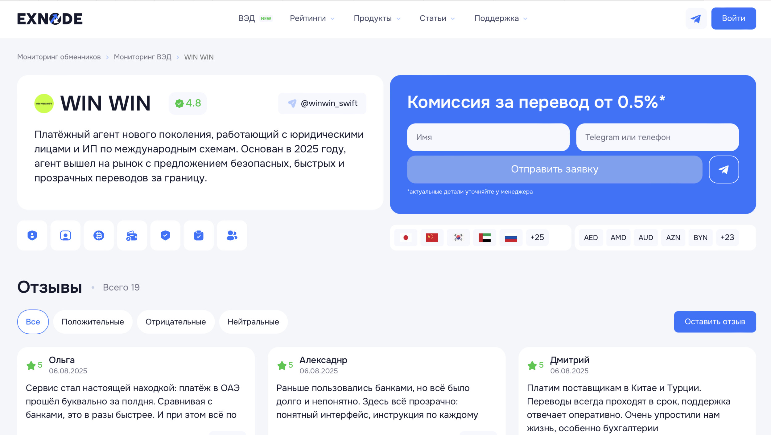 На сайте собраны надежные международные платежные сервисы. Здесь можно сравнить условия разных агентов, изучить комиссии, валюты и сроки перевода. В отличие от банков, где клиенту приходится уточнять, в каких направлениях Свифт работает в России, на Exnode сразу видны доступные варианты.