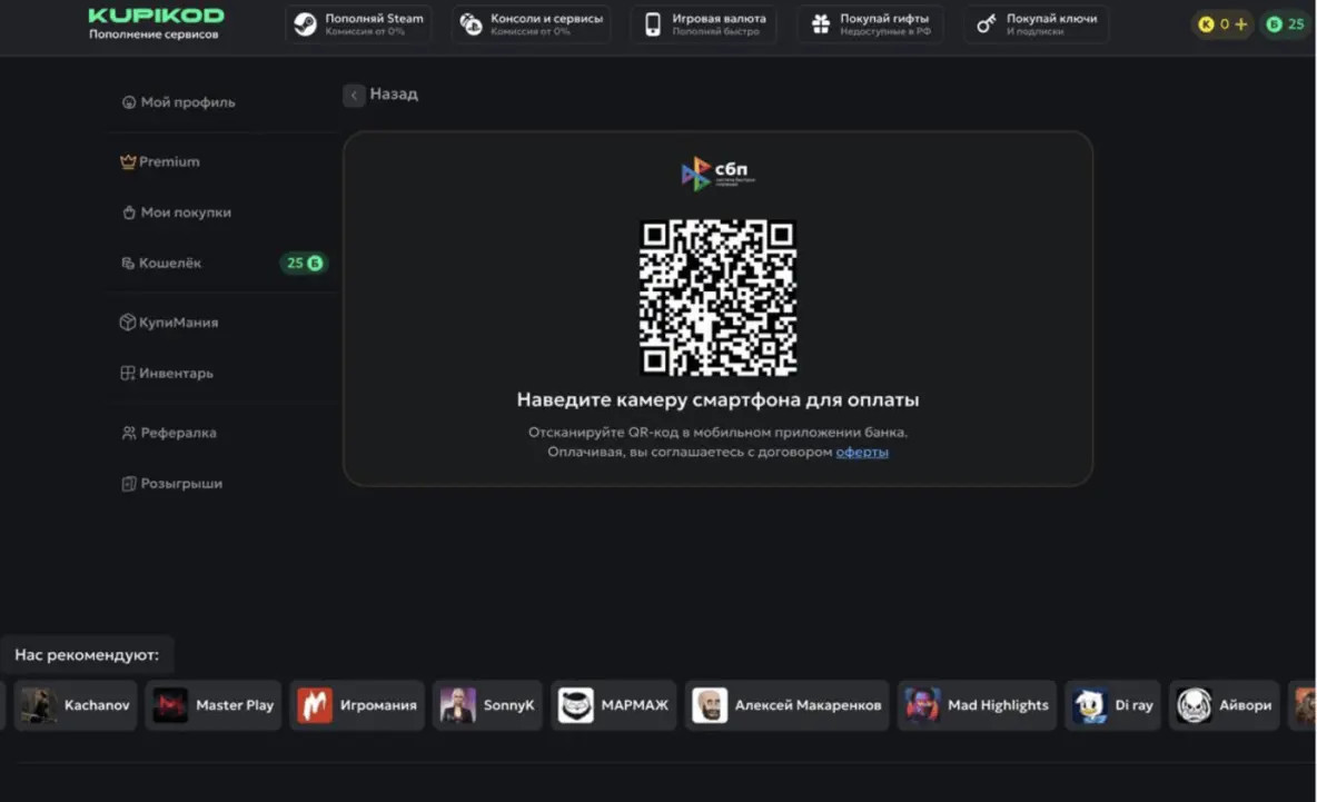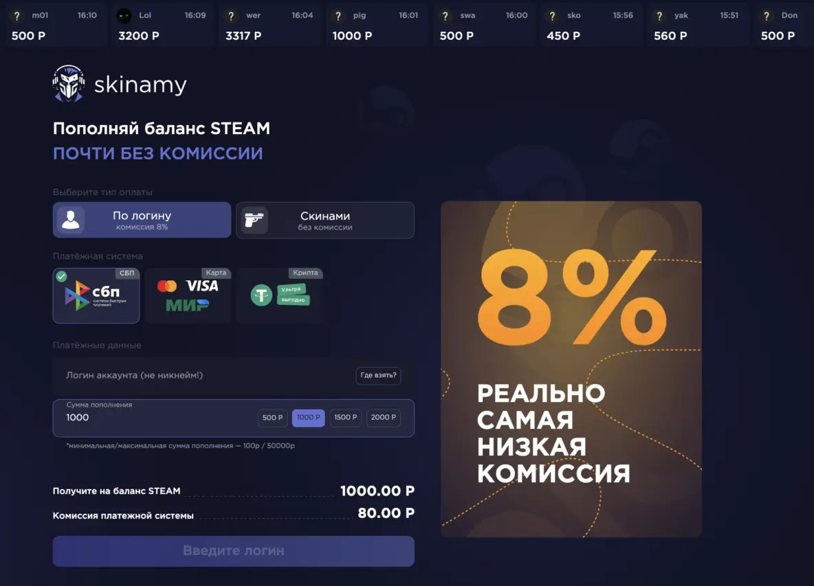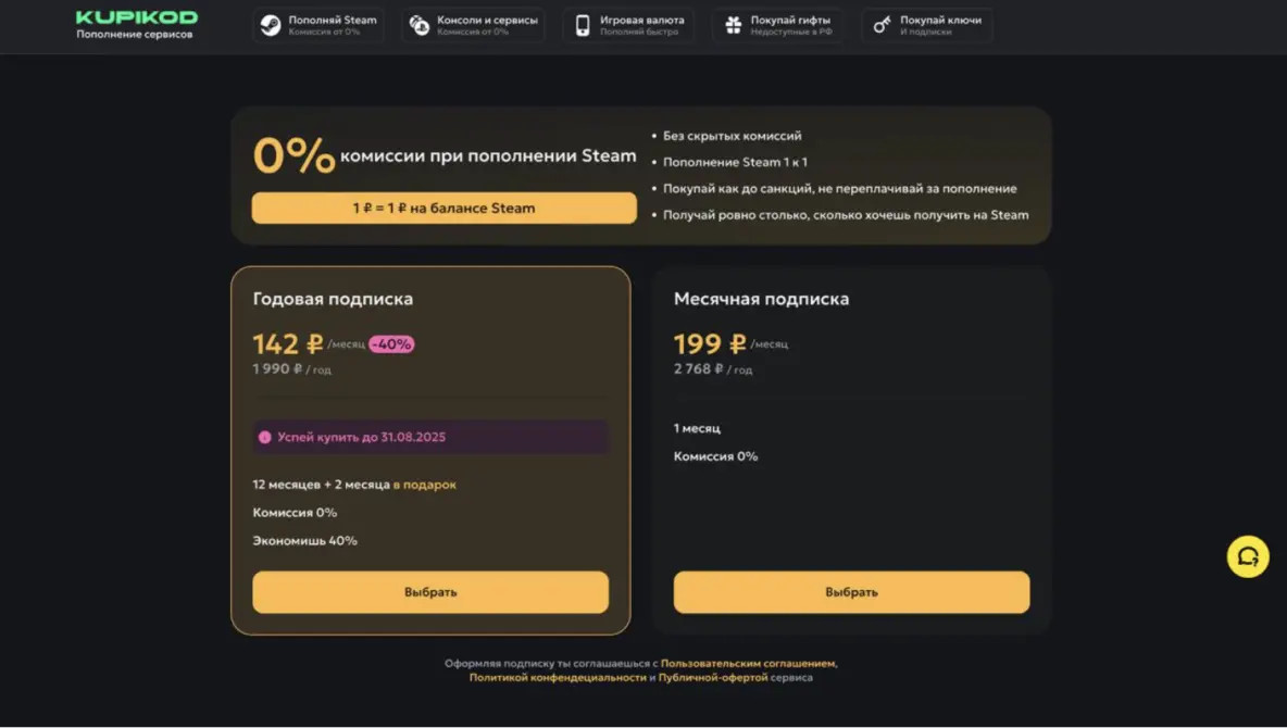 Если вы ищете, где можно пополнить Стим без комиссии или же с минимальной надбавкой, обратите внимание на проверенные площадки. Они позволяют избежать лишних переплат и предлагают удобные способы оплаты. Вот список самых надежных вариантов для пользователей из России. 1. КупиКод — выгодные условия с комиссией 0% Этот сервис идеально подходит для тех, кто хочет пополнять Стим без комиссии в 2025 на постоянной основе. Его уникальное предложение — функция Premium, которая полностью исключает переплаты. Как работает: Премиум стоит 199 рублей в месяц или 1990 рублей в год и позволяет пополнять Steam без комиссий безлимитное количество раз. Он фиксирует курс 1:1. Например, за 1000 рублей вы получите ровно 1000 рублей на счет Steam. Что еще доступно: Цифровые ключи для игровых платформ, подписки на Netflix, Spotify, внутриигровая валюта. Этот вариант отлично подходит для регулярного пополнения аккаунта Стим России без комиссии в 2025 году. 2. GGSEL — универсальный маркетплейс с низкой комиссией Для тех, кто ищет, где пополнить Стим с минимальными издержками, GGSEL предлагает выгодные условия. Площадка известна широким ассортиментом и надежностью. Особенности: Здесь можно пополнить баланс Steam, PlayStation, Xbox, купить ключи игр или подписки. Комиссия: от 5%. Сначала вам может попасться продавец с высокой комиссией (10-12%). Чтобы найти лучшее предложение, введите «Igromagaz» в поисковую строку на сайте и выберите предложение по пополнению Steam с комиссией 5%. Оплата: Карты (включая «Мир»), СБП, электронные кошельки и тд. Зачисление средств происходит мгновенно. Это один из лучших способов пополнения с помощью популярных платежных методов. 3. Keysforgamers — кэшбэк для постоянных клиентов Данный сервис предлагает систему лояльности, которая позволяет со временем выйти на пополнение Стим аккаунта без комиссии за счет возврата части средств. Как работает кэшбэк: Преимущества: Активные пользователи могут компенсировать стандартную комиссию, делая покупки еще выгоднее. Это отличный вариант для тех, кто планирует регулярно пополнять Стим кошелек в России без комиссии. 4. Skinamy — уникальный способ пополнения через игровые предметы Этот сервис предлагает нестандартный, но эффективный метод пополнить Стим 2025 года с возможностью свести комиссию к нулю. Он использует игровые предметы (скины) для конвертации средств. Как это работает: Варианты продажи: Важно: Сервис не работает со скинами из CS2 из-за ограничений торговли. Комиссия: 8% при использовании стандартного метода пополнения по логину, 0% при оплате скинами при продаже по рыночной цене. Этот способ подойдет опытным игрокам, которые хотят пополнить Стим без комиссии в 2025 в России с помощью знакомых механизмов, хоть и с потерей времени. Каждый из этих сервисов предлагает свои преимущества. Выбор зависит от ваших предпочтений: регулярные покупки, минимальные издержки, кэшбэк или нестандартные подходы. Если вы хотите пополнить баланс Стим в России без комиссии, эта инструкция поможет вам сделать всё быстро и безопасно. Мы разберем процесс на примере сервиса КупиКод Premium, который предлагает выгодные условия с нулевой комиссией. Шаг 1: Перейдите на мониторинг Exnode Здесь вы можете сравнить платформы для пополнения по различным параметрам: комиссия, способы оплаты и другие условия. Шаг 2: Выбор сервиса Для пополнения Стим без комиссии выберите проверенн