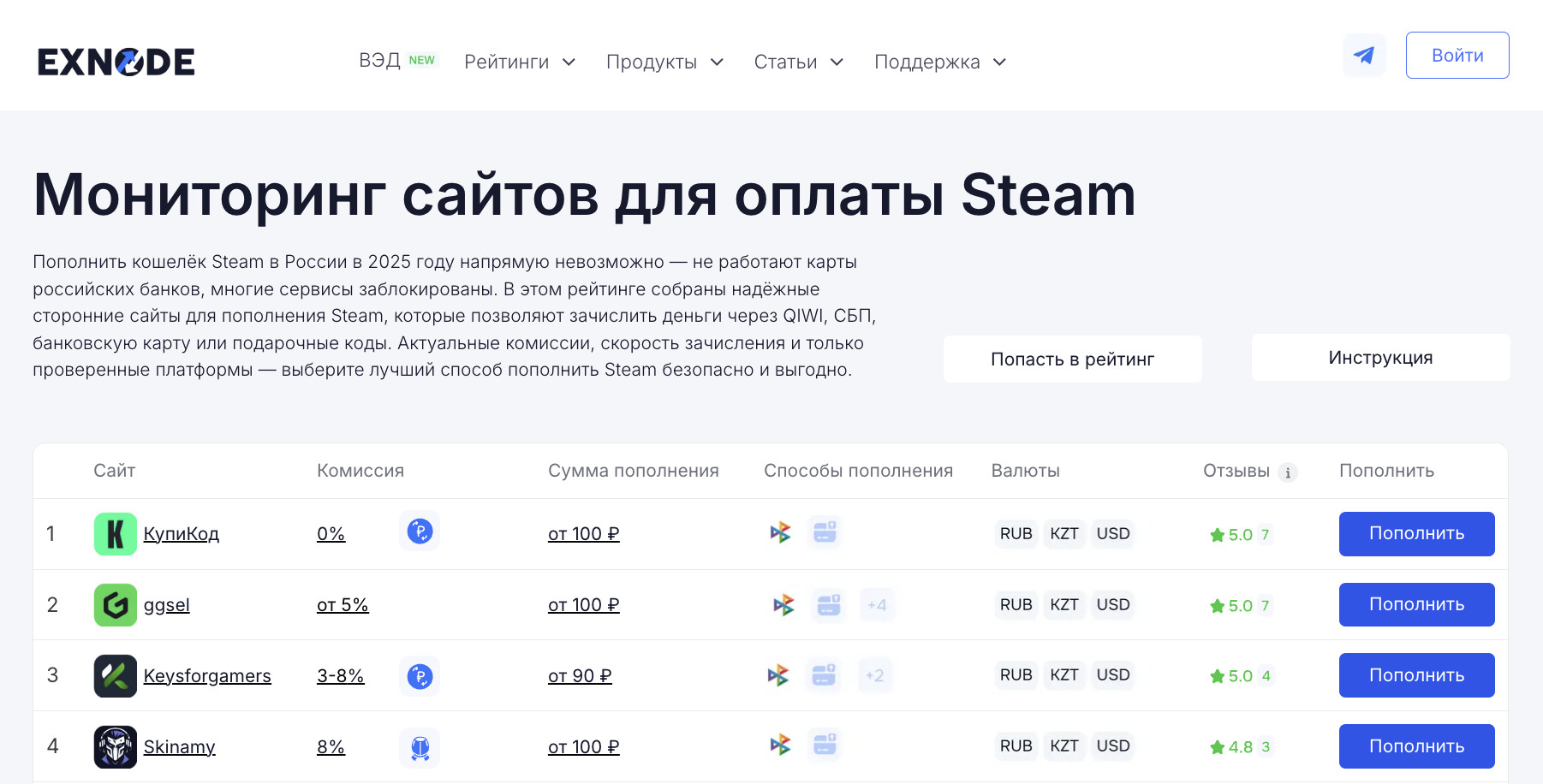 Примечательно, что тема пополнения Steam через сторонние сервисы уже упоминалась в недавней статье на РБК, и выяснилось: на сегодняшний день наиболее удобным, безопасным и выгодным способом остается использование платежного посредника. Именно такой подход, в отличие от устаревших официальных методов, гарантирует не только скорость, но и реальную экономию. Чтобы предоставить вам максимально достоверную информацию, мы опирались на данные независимого мониторинга сервисов для пополнения Steam от Exnode — это площадка, где собраны и проанализированы лучшие сервисы для оплаты игр в Steam. Дальше вы узнаете как пополнить баланс Стима в 2025 году через проверенные платформы, которые уже выбрали тысячи игроков по всей стране и за ее пределами.