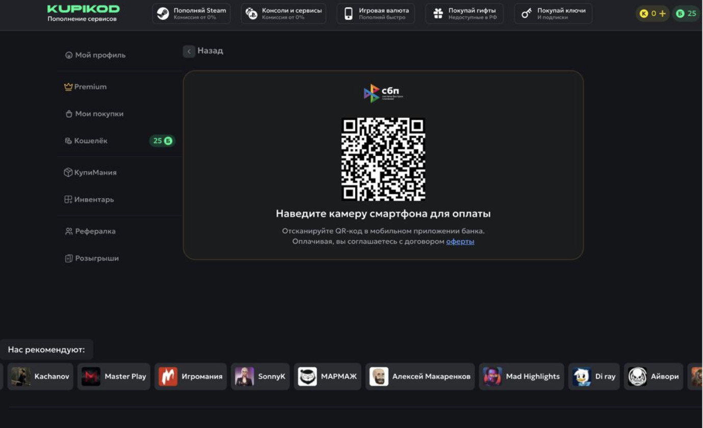 Если вы ищете как пополнить Стим в России в 2025, обратите внимание на эти четыре проверенных сервиса. Каждый из них предлагает уникальные преимущества — от нулевой комиссии до пополнение баланса скинами. Вот детальный обзор, который поможет вам сделать осознанный выбор. 1. КупиКод — идеальный вариант без комиссии Для тех, кто хочет пополнить Стим с комиссией 0% в 2025, этот сервис — один из лучших вариантов. Его ключевое преимущество — Premium, который полностью исключает переплат. Как это работает: Для доступа к лучшему курсу необходимо подключить функцию Premium: После активации Premium вы можете пополнять баланс Steam безлимитное количество раз. Дополнительные возможности: Для кого подойдет: Для тех, кто регулярно пополняет баланс и хочет избежать переплат. 2. GGSEL — универсальный маркетплейс с мгновенным зачислением Этот сервис подойдет не только тем, кто ищет как пополнить аккаунт Стим в 2025, но и купить игры, подписки и внутриигровую валюту. Что предлагает платформа: Как снизить комиссию: Стандартная комиссия — от 5%; Если вам попалась комиссия в размере 10-12%, не переживайте. Для минимальной комиссии в поиске укажите «Igromagaz» и выберите товар на пополнение игрового баланса этого продавца (указано на скриншоте). Преимущества: Для кого подойдет: Для тех, кто ищет не только как пополнить Стим в 2025, но и хочет купить игры или подписки в одном месте. 3. Keysforgamers — выгодный кэшбэк для постоянных пользователей Если вас интересует как пополнить баланс Стима в 2025 году и вы планируете делать это неоднократно, сервис предлагает систему вознаграждений. Как работает кэшбэк: Комиссия при пополнении: Базовая комиссия — 8%, но кэшбек компенсирует затраты. Основные возможности: Для кого подойдет: Для активных пользователей, которые ищут как пополнить Стим в РФ в 2025, готовых делать частые покупки и получать за это вознаграждение. 4. Skinamy — уникальный способ пополнить Стим через игровые предметы Для тех, кто ищет нестандартный метод пополнения кошелька Стим в 2025 году, этот сервис предлагает оплату через скины. Как это работает: Моментально по ордеру (потеря до 5%) или по рыночной цене (ожидание 1-2 часа, но возможна прибыль до +5%). Альтернативный вариант: Обычное пополнение баланса с комиссией 8% (оплата картой, СБП). Преимущества: Для кого подойдет: Для опытных игроков, которые разбираются в рынке игровых предметов и хотят контролировать свои расходы. Теперь вы знаете как выгоднее всего пополнить Стим в 2025. Каждый сервис предлагает уникальные условия — от нулевой комиссией до кэшбэка и работы со скинами. Выбирайте тот вариант, который лучше всего соответствует вашим привычкам и потребностям! Если вы ищете как пополнить Стим кошелек в России в 2025 без лишних затрат и рисков, эта инструкция поможет вам сделать всё правильно. Мы разберем процесс на примере сервиса с нулевой комиссией — КупиКод Premium. Следуйте шагам ниже, чтобы избежать ошибок и сэкономить время. 1. Выбор сервиса через мониторинг Перед тем как пополнить счет в Стиме в 2025, изучите актуальные предложения на специализированных площадках. Используйте мониторинг Exnode, чтобы сравнить курсы и условия разных сервисов. Это поможет выбрать оптимальный вариант для пополнения игрового баланса. 2. Переход на официальный сайт выбранного сервиса 3. Выбор тарифа Premium Это позволит пополнять игровой аккаунт без комиссии по ку