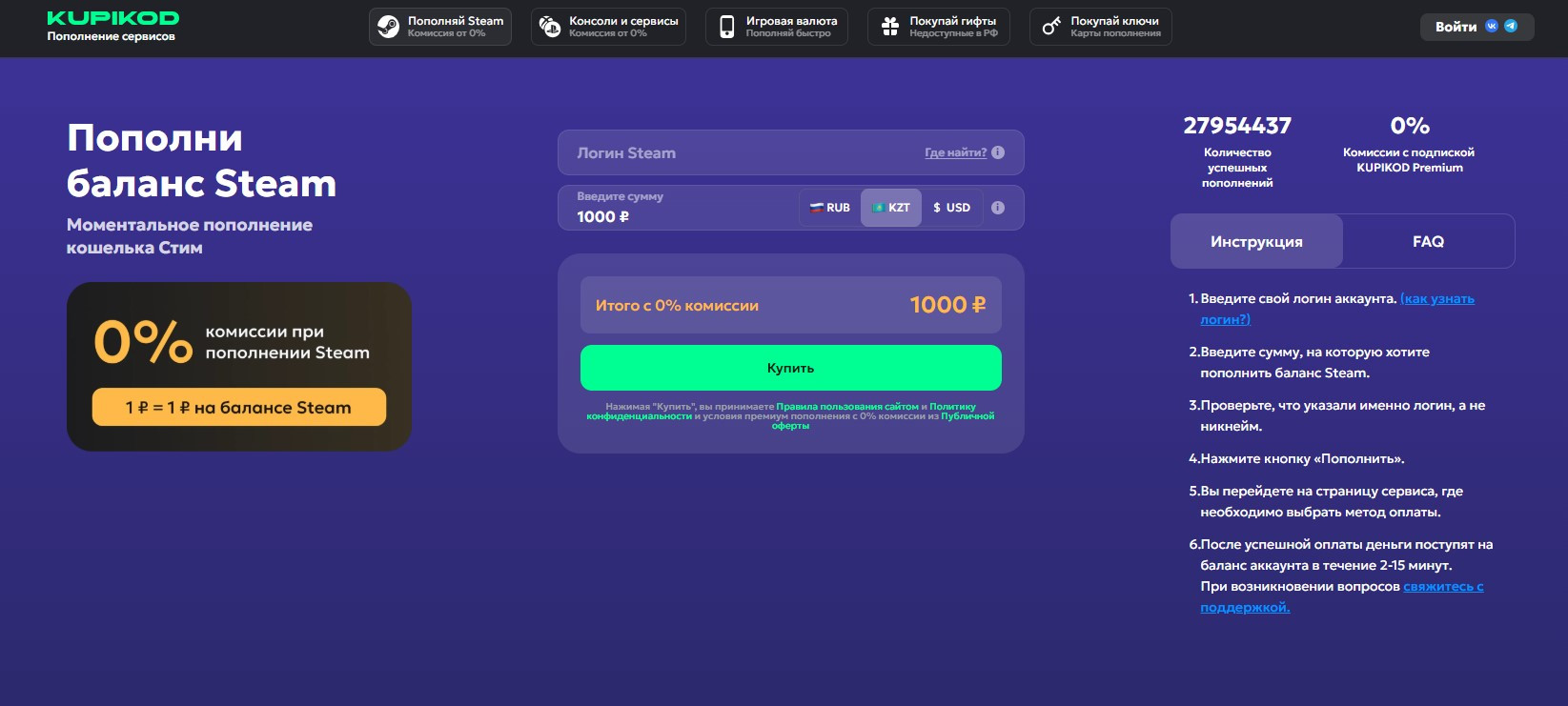 GGSEL — это крупная площадка-агрегатор, где можно выгодно пополнить Стим, а также купить игры, подписки и коды для других платформ. Ключевая особенность: Огромный ассортимент и гибкость цен. Комиссия: Стандартно — от 5%. Важный момент: на сайте много продавцов, и при первом входе система может показать предложения с комиссией 10–12%. Как получить минимальную комиссию? Воспользуйтесь поиском на сайте. Введите «Igromagaz» — это продавец с фиксированной комиссией 5% для пополнения Steam. Способы оплаты: СБП, банковские карты, WebMoney, подарочные карты. Поддерживаемые валюты: RUB, USD, KZT. Для кого: Для тех, кто ищет надежность и стабильную выгоду без сложностей. Если вас интересует через что выгоднее пополнять Стим, ответ — GGSEL. 2. Вторая платформа в нашем рейтинге — Keysforgamers Keysforgamers — специализированный сервис для геймеров с мощной системой лояльности, которая делает его одним из самых выгодных способов пополнить Стим в долгосрочной перспективе. Ключевая особенность: Многоуровневый кэшбэк, который компенсирует комиссию. Комиссия: Базовая ставка — 8% (включая сервисный сбор). Однако на каждую покупку начисляется кэшбэк баллами, который можно тратить на следующие платежи. Система кэшбэка: Таким образом, активные пользователи могут выйти на пополнение с нулевой или даже отрицательной комиссией. Способы оплаты: СБП, банковские карты. Поддерживаемые валюты: RUB, USD, KZT. Для кого: Для тех, кто регулярно покупает игры и хочет получать максимум от каждой траты. Это тот случай, когда выгоднее всего пополнять Стим часто благодаря прогрессивной системе вознаграждений. 3. Еще один надежный сервис для пополнения баланса Steam — Skinamy Skinamy предлагает, пожалуй, самый нестандартный и потенциально выгодный способ выгодно пополнить Стим — с использованием игровых предметов. Ключевая особенность: Возможность избежать комиссии через пополнение скинами. Комиссия: Как это работает? После оплаты вы получаете не деньги на баланс, а ликвидные скины из Dota 2, Rust или TF2. Далее вы сами продаете их на торговой площадке Steam. Важно: CS2-скины не используются из-за их 7-дневной торговой блокировки. Способы оплаты: СБП, банковские карты. Поддерживаемые валюты: RUB, USD, KZT. Для кого: Для продвинутых пользователей, которые разбираются в механике Steam Market и готовы потратить немного времени для максимальной экономии. Вывод: Для тех, кто ищет как пополнить Стим самое выгодное предложение — это оптимальный, хоть и не самый быстрый путь с минимальными затратами. 4. Последний сервис в нашем рейтинге — КупиКод КупиКод — еще один популярный сервис, который компенсирует стандартную комиссию за счет системы бонусов и промокодов. Ключевая особенность: Гибкая система скидок, зависящая от суммы пополнения и использования бонусов. Комиссия: Бонусы: При регистрации начисляются стартовые 50 баллов. Способы оплаты: СБП, банковские карты, бонусные баллы. Поддерживаемые валюты: RUB, USD, KZT. Для кого: Для пользователей, которые активно используют промокоды и готовы разобраться в накопительных системах. Однозначного ответа на вопрос «Где выгоднее всего пополнять Стим?» нет — всё зависит от ваших привычек. Выбирайте тот способ, который подходит именно вам, и пополняйте Стим выгодно в 2025 году без лишних переплат. Чтобы найти лучший способ выгодно пополнить Стим, недостаточно просто выбрать первый попавшийся сервис. Нужно ср