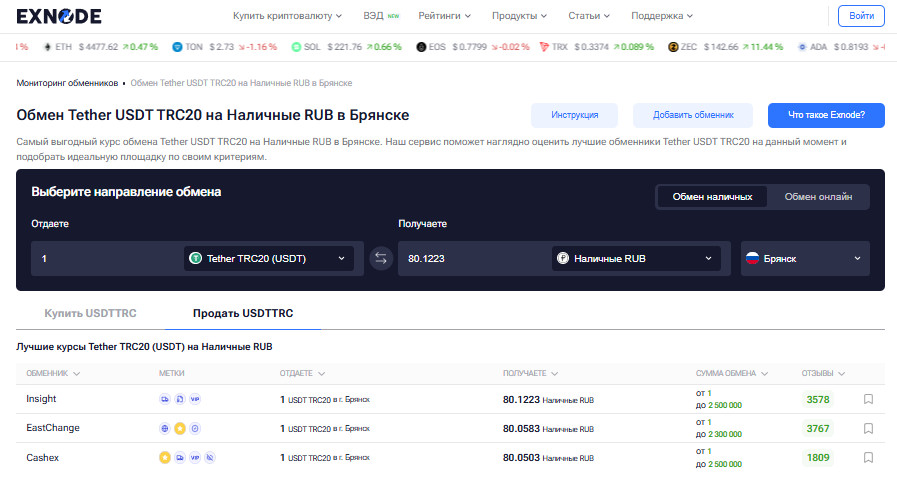 Для выбора надежного офлайн-обменника в Брянске удобно использовать независимые сервисы мониторинга, такие как Exnode. Они позволяют сравнить рейтинги обменников, изучить отзывы реальных клиентов и заранее определить, какие офисы обеспечивают прозрачные и безопасные условия для покупки и обмена криптовалюты.
