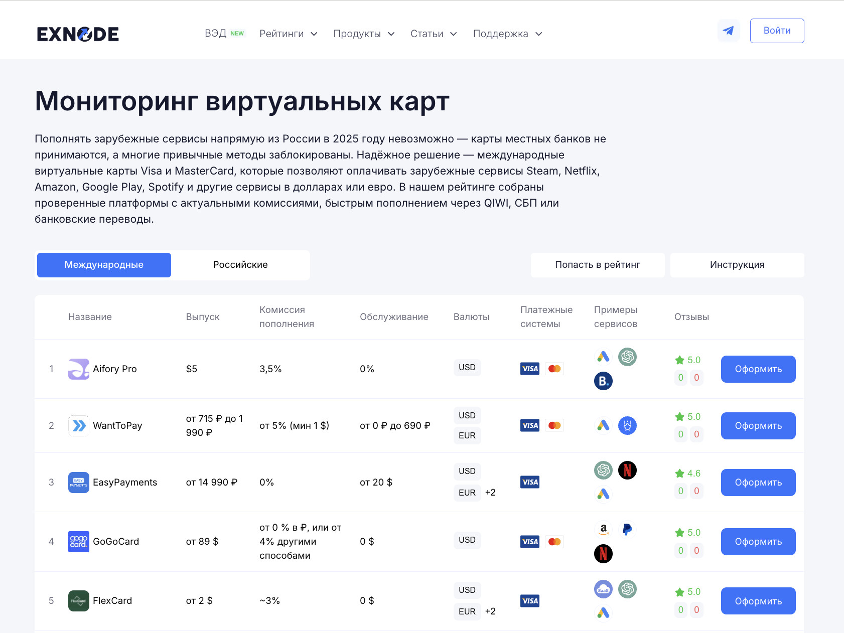 Чтобы подобрать оптимальный вариант, стоит воспользоваться мониторингом российских и иностранных карт Exnode — это удобный онлайн-сервис, где можно сравнить предложения по ключевым параметрам (названия, тип карты, условия выпуска, комиссии и так далее). Такой мониторинг помогает выбрать надёжное решение, сравнить комиссии и избежать лишних затрат. В следующих разделах мы подробно разберём, какие иностранные банковские карты считаются лучшими в 2025 году и как их оформить без сложностей. Ниже — реальные и доступные для россиян решения из мониторинга. Это банковские карты иностранных банков и финтех-платформы с дистанционным выпуском. Под каждую задачу — свой вариант: где-то проще пополнять рублями, где-то выгоднее обслуживание. Все примеры подходят, если вам нужна иностранная банковская карта для россиян для оплаты зарубежных сервисов и подписок, бронирований и онлайн-покупок. WantToPay Удобный старт для тех, кто хочет оформить карту быстро и недорого. Выпуск — от ~715 до 1 990 ₽, обслуживание от 0 до ~690 ₽, пополнение — от 5% (минимум $1). Доступны USD/EUR, работают Visa/Mastercard. Подходит для регулярных онлайн-платежей: подписки, реклама, маркетплейсы. Если цель — оформить иностранную банковскую карту с минимальным порогом входа, это ровно тот случай. EasyPayments Решение с удалённым выпуском карт зарубежных банков: без поездок и с полноценной поддержкой. Выпуск — от ~14 990 ₽, комиссия за пополнение заявлена как 0%, обслуживание — от ~$20. Валюты USD/EUR (+ доп. варианты), платёжная система — Visa. Выглядит как вариант «под ключ», когда важны предсказуемые платежи и техподдержка. GoGoCard Сильная сторона — условия пополнения: от 0% при пополнении в рублях (и от ~4% другими способами). Выпуск — от ~$89, обслуживание — $0. Валюта — USD, платёжные системы Visa/Mastercard. Подходит тем, кто часто пополняет карту из России и хочет минимизировать издержки на внесение средств. Бонус: скидка 10% на выпуск при использовании промокода EXNODE. FlexCard Самый доступный порог входа: выпуск — от ~$2, обслуживание — $0, пополнение — около 3%. Валюты USD/EUR (+ ещё варианты), платёжная система — Visa. Хороший выбор, если нужна резервная виртуальная карта для онлайн-платежей с минимальными стартовыми расходами. Как выбирать между ними? Смотрите на три вещи: общую стоимость владения (выпуск + обслуживание + комиссия пополнения), поддерживаемые валюты и совместимость с нужными сервисами. В 2025 году перечисленные платформы предлагают виртуальные решения с быстрым дистанционным открытием, либо удаленное открытие физической карты с доставкой. Удобно использовать мониторинг: там в одной таблице сравниваются выпуск, комиссии за пополнение, обслуживание, валюты, платёжные системы, примеры сервисов для оплаты и отзывы — это помогает быстро выбрать оптимальный вариант и не переплачивать. Многие россияне сегодня ищут, как оформить иностранную банковскую карту, чтобы свободно оплачивать зарубежные сервисы, покупки и подписки. В 2025 году сделать это стало проще, чем когда-либо: большинство решений доступны полностью дистанционно. Для сравнения условий удобно использовать мониторинг Exnode — на нём собраны актуальные предложения с комиссиями, валютами, отзывами и примерами сервисов, где карты реально работают. Именно с этого шага и стоит начать. Шаг 1. Перейдите на мониторинг и выберите подходящий сервис На сайте Exnode представлены