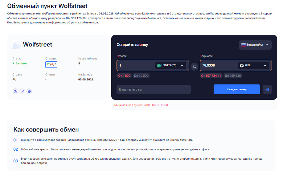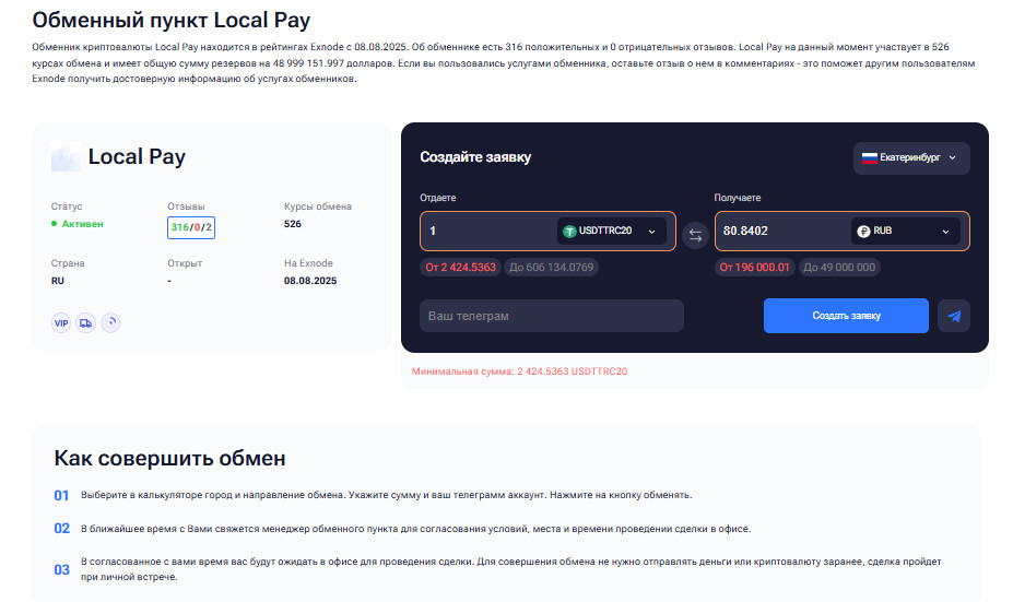 Wolfstreet Один из самых известных обменников криптовалют в Екатеринбурге, где сочетаются надёжность и высокий уровень сервиса. Офис расположен удобно для личного визита, а сотрудники готовы подробно объяснить процесс обмена и помочь с техническими нюансами — от проверки кошелька до перевода средств. Преимущества: Local Pay Этот криптообменник в Екатеринбурге ориентирован на тех, кто ценит скорость, надёжность и человеческий подход. Здесь делают акцент на консультациях и поддержке пользователей, особенно новичков, впервые решивших купить криптовалюту в Екатеринбурге. Менеджеры помогают разобраться с выбором сети и особенностями перевода USDT, чтобы исключить ошибки и недоразумения. Преимущества: Insight Современный и технологичный обменник крипты в Екатеринбурге, который выделяется чёткой организацией процессов и внимательным отношением к каждому посетителю. Здесь можно обменять или купить USDT в Екатеринбурге или обменять другие популярные активы в спокойной, безопасной обстановке. Команда следит за качеством обслуживания и помогает клиентам совершать сделки максимально удобно. Преимущества: Каждый из этих обменников демонстрирует, что обмен криптовалюты в Екатеринбурге может быть не только безопасным, но и комфортным. Благодаря рейтингу и отзывам пользователи могут выбрать надёжное место для сделок и быть уверенными в прозрачности и профессионализме обслуживания. Правильный выбор площадки для обмена криптовалюты в Екатеринбурге — залог безопасности ваших средств и успешного опыта работы с цифровыми активами. От качества сервиса и прозрачности процедур напрямую зависит, насколько комфортно и спокойно вы сможете провести сделку. Вот несколько важных критериев, на которые стоит обратить внимание при выборе офлайн-точки обмена. Выбирая обменник осознанно, вы не только минимизируете риски, но и получаете уверенность, что операция с цифровыми активами пройдёт спокойно, безопасно и на выгодных условиях. Обмен криптовалюты в Екатеринбурге через проверенные офлайн-точки остаётся одним из самых надежных и безопасных способов купить или продать цифровые активы. Личный визит в офис позволяет контролировать каждый этап сделки, убедиться в легальности площадки и избежать рисков. Ниже приведен подробный алгоритм, который поможет провести обмен крипты в Екатеринбурге грамотно и с уверенностью: Для начала изучите список проверенных офлайн-офисов и рейтинги криптообменников в Екатеринбурге. После выбора подходящего обменника уточните все детали будущей операции: Перед визитом в криптообменник в Екатеринбурге убедитесь, что всё готово для безопасной сделки: Приезжайте в выбранный обменник крипты в Екатеринбурге в согласованное время: На этом этапе совершается непосредственный обмен криптовалюты в Екатеринбурге: После завершения сделки обязательно сохраните все доказательства проведения обмена: Следуя этому пошаговому руководству, вы сможете безопасно обменять или купить USDT в Екатеринбурге или провести другую операцию с цифровыми активами, используя проверенные обменники криптовалют в Екатеринбурге с высокой репутацией и профессиональным обслуживанием. Первое посещение офлайн-офиса для проведения обмена криптовалюты в Екатеринбурге может вызвать волнение, особенно если вы раньше работали только с онлайн-серв