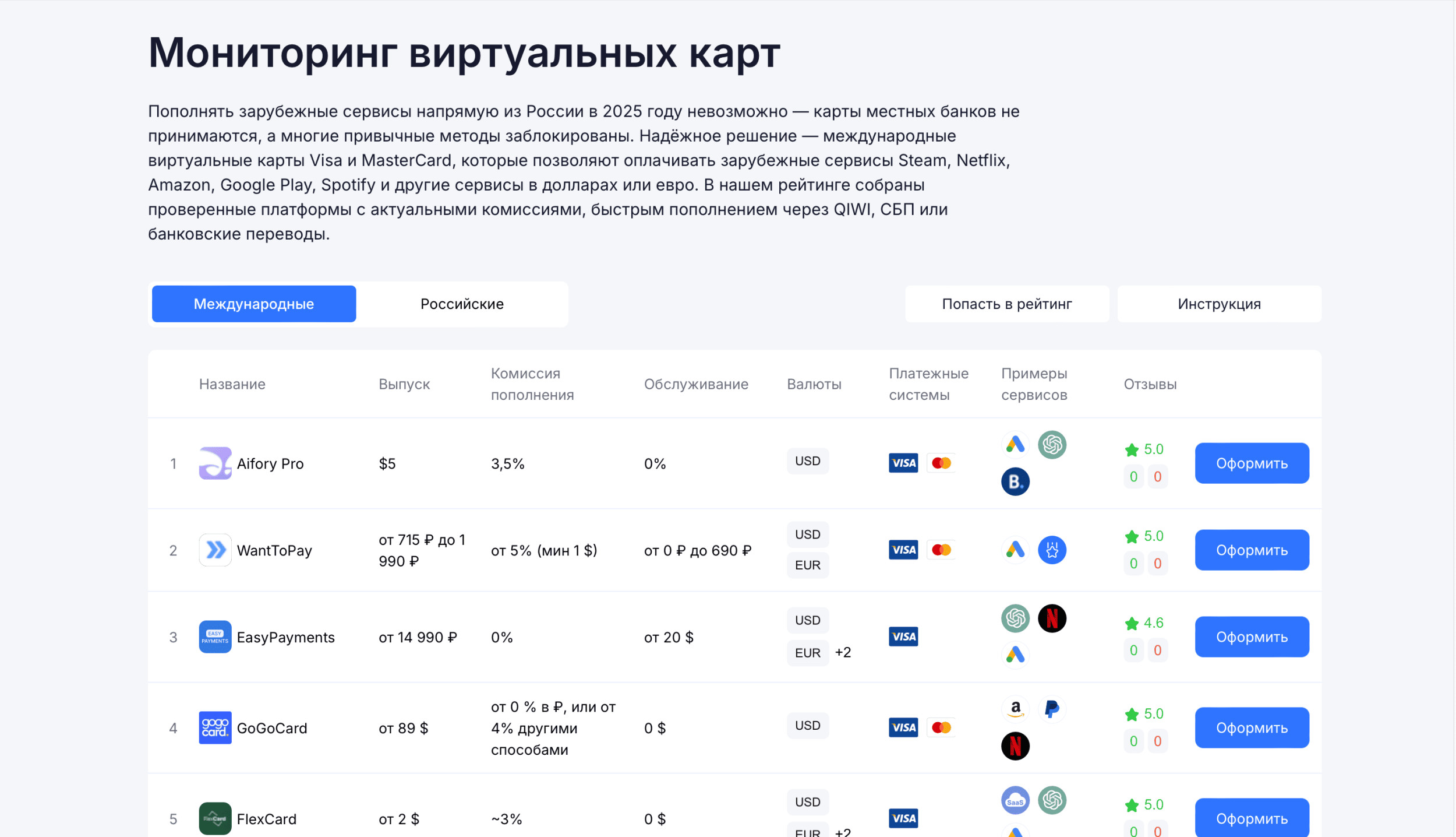 Шаг 1. Выбор сервиса для создания виртуальной карты виза