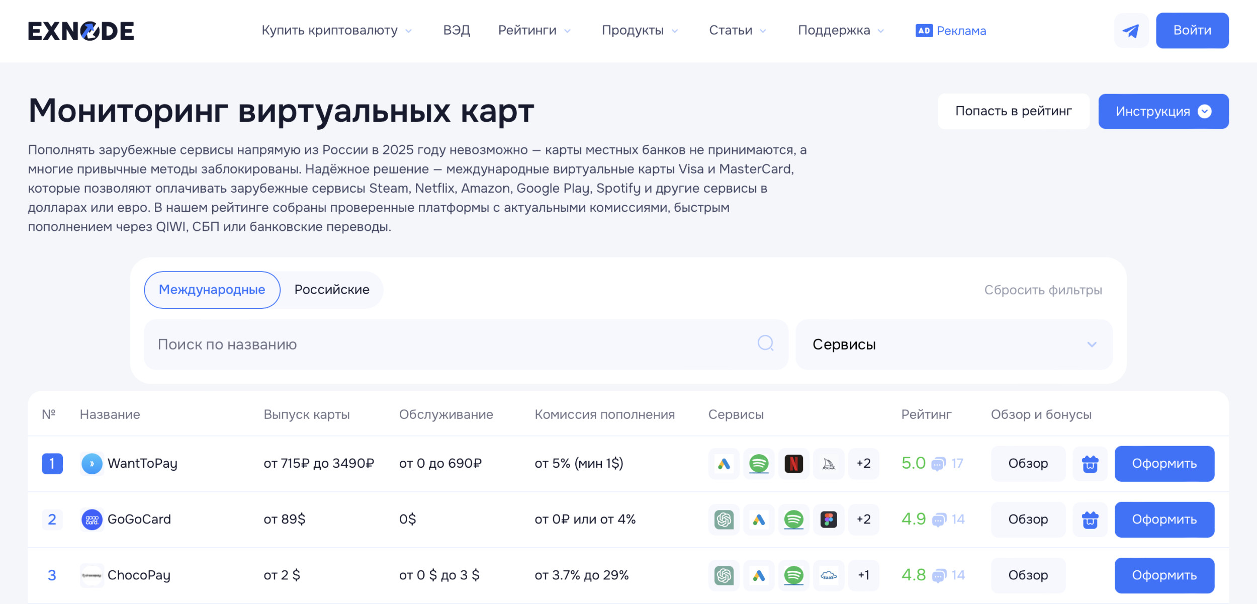 Если вы ищете виртуальную карту для оплаты за границей, важно выбрать платформу с прозрачными комиссиями и надёжной поддержкой. С этим помогает мониторинг виртуальных карт Exnode — он сравнивает условия разных сервисов, показывает реальные комиссии и помогает понять, какую карту для оплаты за границей оформить, чтобы всё работало стабильно и без отказов.