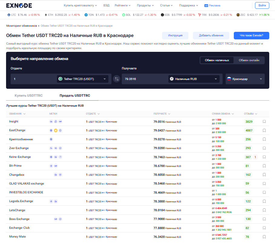 Первым этапом является подбор надёжного офлайн-офиса. Для этого рекомендуется использовать мониторинг Exnode, где представлены проверенные обменники криптовалюты в Краснодаре с актуальными контактами, рейтингами и отзывами клиентов.