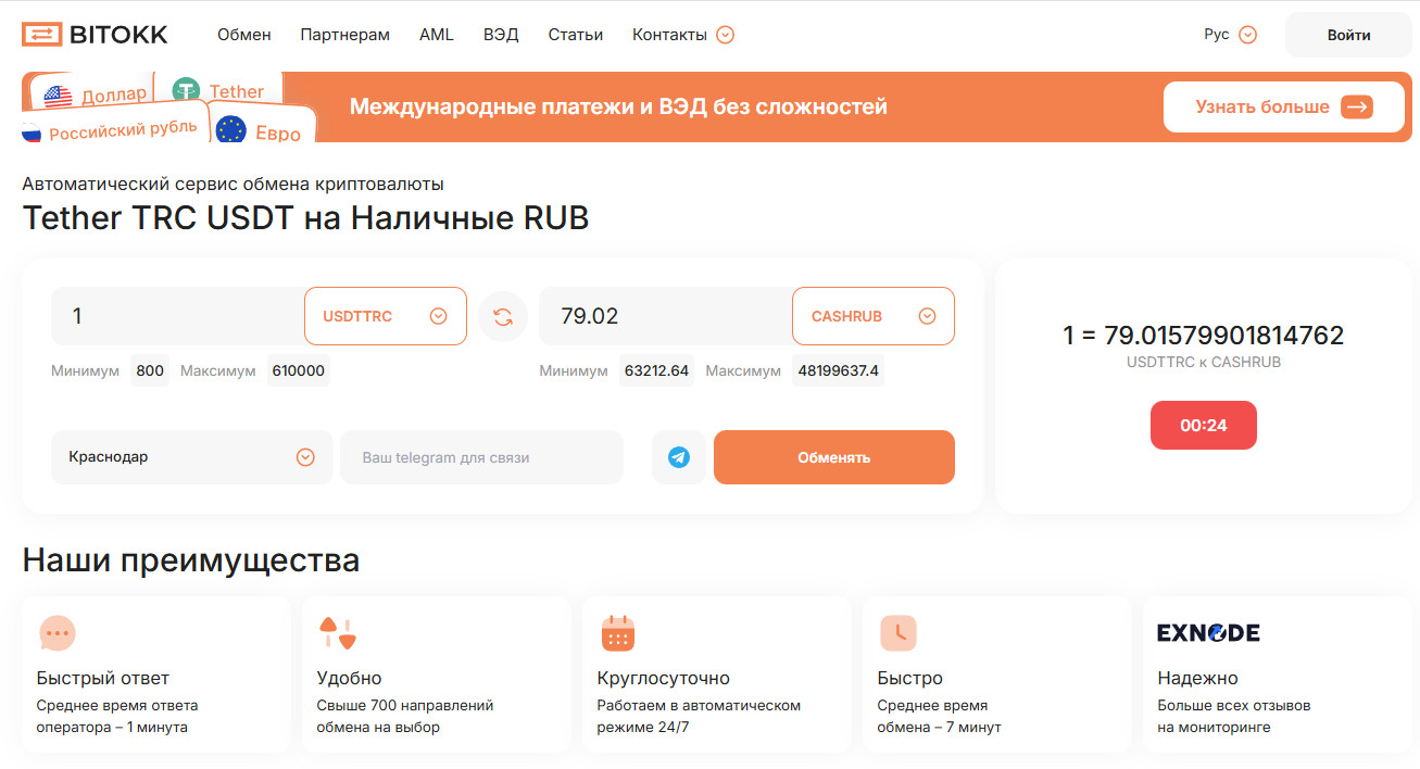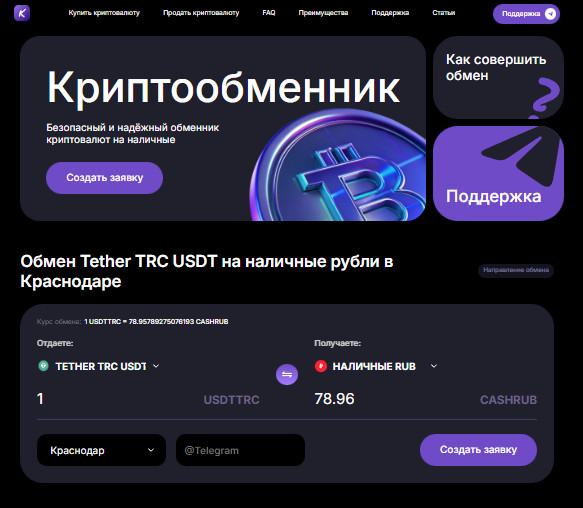 - Поддержка активов, включая USDT в Краснодаре и BTC;