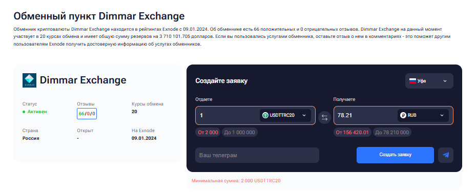 Dimmar Exchange ориентирован на клиентов, которым важны скорость и четкая структура сделки. Отличный выбор для тех, кто хочет обменять или купить USDT в Уфе с минимальными рисками.