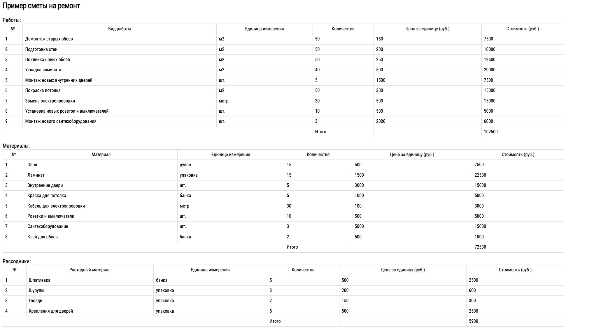 Смета на ремонт — это важный инструмент для планирования и контроля процесса ремонта. Она помогает не только оценить стоимость работ и материалов, но и определить ожидаемые сроки выполнения работ.