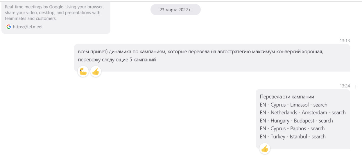 Мы начали вести рекламу в сентябре 2020, с 5 европейских городов, а к концу года откручивали уже 50. Ко второму кварталу 2021 работало больше 100 рекламных кампаний отдельно на каждый город. Весь год мы стабильно выполняли KPI. Работа, в сущности, свелась к одному и тому же процессу: проводили базовую оптимизацию, управляли ставками, расширяли семантику. В начале 2022 года вместе с клиентом приняли решение, что пора масштабироваться. Составили и согласовали стратегию на 4 месяца. Предложили использовать новые инструменты, такие как тестирование КМС, запуск рекламы на конкурентов в Google, запуск кампаний в США, тестирование ФБ. Старт был запланирован на начало марта. Но из-за блокировок платежных систем запустить новую стратегию в срок мы не успели. Ключевая гипотеза — автостратегии должны дать прирост трафика и конверсий. Нужно увеличить бюджет, оставаясь в рамках KPI. Кроме того, управлять ставками вручную, когда в аккаунте сотни кампаний, трудозатратно. Если автостратегии работают лучше, то у специалиста освобождается время на стратегические задачи вместо операционных. «Максимум конверсий» по 5 кампаний каждую неделю. Переводили на авто итерациями по 5 кампаний, а не сразу все. Чтобы анализировать результат и, в случае неудачного теста, откатывать кампании к предыдущим настройкам. Расход увеличился в 2 раза, количество конверсий — тоже. Стоимость конверсии осталась на прежнем уровне. Поняли, что старт удачный, и продолжили перевод кампаний на автостратегии. По сравнению с 17.03.2021-17.04.2021 и равным периодом 17.03.2022-17.04.2022, мы увеличили бюджет в 2 раза. Количество конверсий при этом выросло в 3 раза: Что можем порекомендовать при работе с автостратегиями в Google Ads: