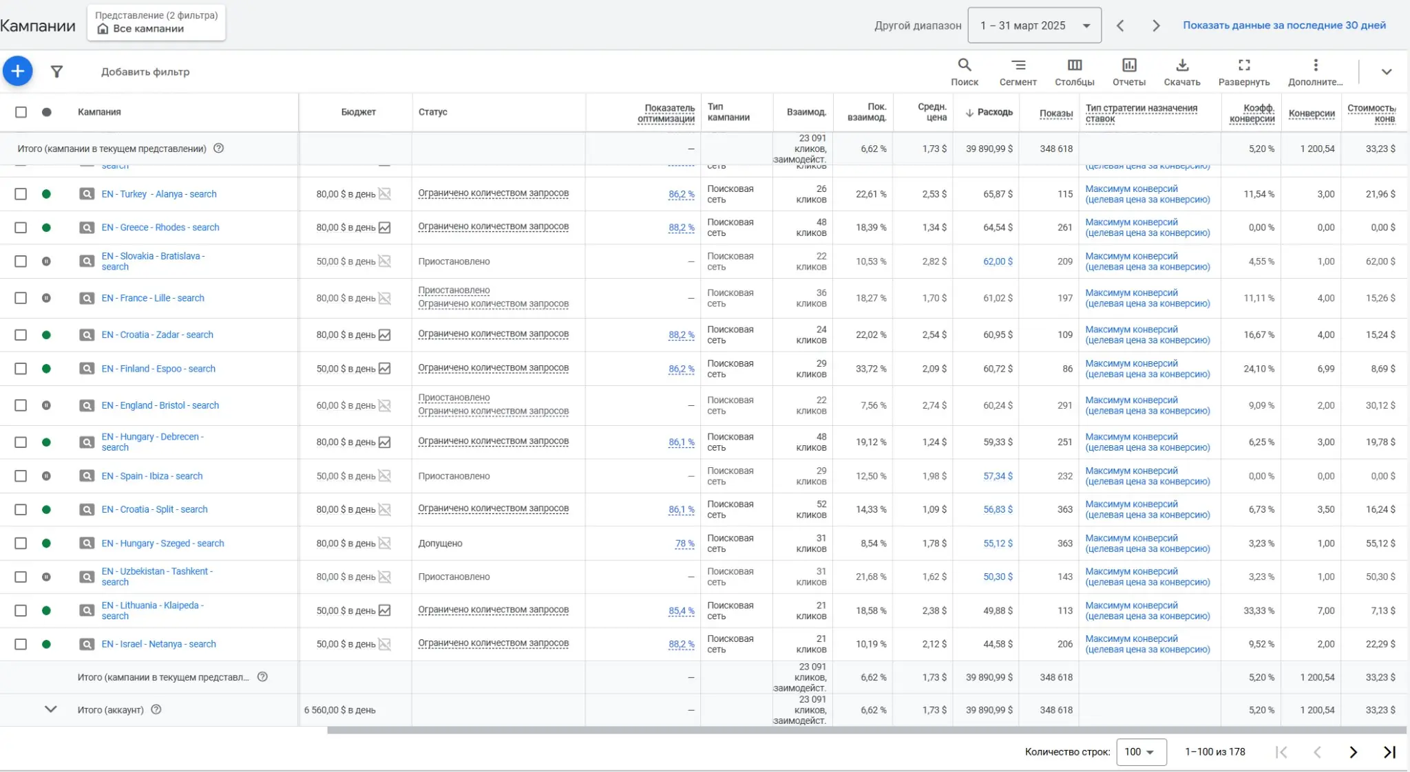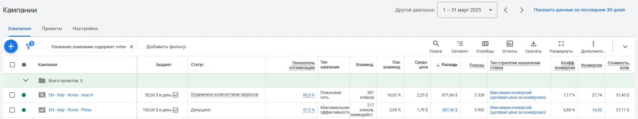 Пример эффективного управления разными видами кампаний для одного города: Пример управления семантически ядром внутри РК в зависимости от эффективности кампании: Вывод: Имея богатый опыт в различных нишах и понимание принципов работы рекламных инструментом можно с 0 выйти на миллионные обороты евро в год, главное это гибкий подход, оптимизация от целей бизнеса и нацеленность на конечный результат. Работая на рынке недвижимости вы можете столкнуться с следующими проблемами:Проблемы: За 10 лет работы мы реализовали проекты на различных рынках, в разных странах и ценовых сегментах. Среди наших ключевых кейсов — такие известные проекты, как «Приан», «Хайтс» и «Вайтвил». Наш опыт охватывает объекты от доступных квартир стоимостью 30 тыс. евро до элитных вилл в Испании за 2 млн евро. Важно отметить, что ценовой сегмент объекта напрямую влияет на выбор стратегии продвижения: для каждого проекта мы разрабатываем индивидуальный подход, учитывающий его специфику и целевую аудиторию.Теперь давайте разберем как мы боролись с проблемами при продвижении и как работаем с разными ценовыми сегментами. Благодаря объединению нескольких стран в одну РК смогли получать лиды в два раза дешевле поиска при сохранении качества. Приан: Пример марта месяца 25 года. Хайтс: Наиболее гибкая и не тривиальная отрасль для продвижения. Рассмотрим два примера из отрасли, в первом мы работаем на генерацию целевых лидов для сервиса аналитики маркетплейсов, во втором случае мы помогаем рекрутерам искать программистов с нужными скилами. Стратегия: Поисковые кампании + PMax. Результаты: Стратегия:Таргетинг на узкие запросы (например, "разработчик Python с опытом 5+ лет").Ретаргетинг через КМС. Google Ads в 2025 году предлагает множество инструментов для роста бизнеса, но их успех зависит от гибкости и глубокого понимания ЦА. Ключевые принципы: Примеры компаний из статьи доказывают: даже в сложных нишах можно достичь высоких результатов, если сочетать аналитику, креатив и постоянную оптимизацию. Начните с малого, учитесь на данных — и масштабируйтесь!