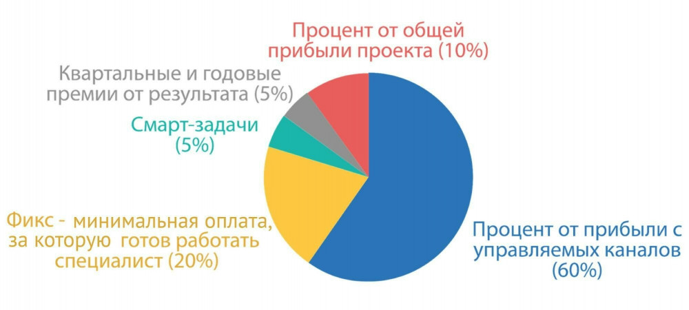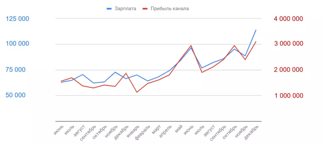 Тем не менее, случаи удачного найма бывают: так мы нашли директора по маркетингу и руководителя performance-маркетинга для команды «Всемайки.ру». А руководителя производства и руководителя отдела аналитики в Finepromo взяли с хорошим опытом, но с нераскрытым потенциалом на текущем месте работы. В нашей практике самым выгодным оказался вариант обучить выпускников ВУЗов с необходимыми soft skills. Такой подход требует ресурсов на создание грейдов, ступеней для горизонтальной карьеры сотрудника, чтобы дополнительно стимулировать его развиваться, а также системы обучения и времени на сам процесс. Но в долгосрочной перспективе это окупится: вы получите команду профессионалов, которые лояльны к тем, кто их обучил, к компании и разделяют ее ценности. В нашей команде Finepromo руководитель клиентского сервиса и продаж и руководитель платного трафика — специалисты, которых мы воспитали и обучили с нуля. Они пришли к нам без опыта в интернет-маркетинге, но у них были правильные soft skills и желание развиваться. Но воспитать руководителя из специалиста без опыта — задача непростая: сначала его нужно обучить, а потом подготовить его к управлению людьми. Но и эти вложения оправдывают риски и материальные издержки, которые вы можете понести при найме «звезд». Особенно для руководящих должностей Работайте с теми, у кого есть необходимые вам качества. А обучиться hard-skills целеустремленному человеку нетрудно. Многие сотрудники привыкли к стандартной мотивации — фикс + премия за достижение общего показателя. У такого подхода есть недостатки: постоянная зарплата со временем перестает мотивировать — к ней начинают относиться как к данности. В маркетинге все измеримо, и потому логично применять мотивацию, привязанную к личному результату работника и совпадающую с целями бизнеса. В таком случае мотивация должна зависеть от роста прибыли с рекламного канала (например, Яндекс.Директа), за который отвечает специалист. И это хорошо, потому что тогда цели специалистов совпадают с целями владельца бизнеса, а сотрудник видит связь результатов труда с уровнем заработной платы. Например, может быть такая мотивация: M = 5% * (прибыль с канала) + 20 000. Специалист получает фиксированную часть в 20 000 рублей и 5% от прибыли с канала. Мы анализируем общую статистику по сотрудникам в формате ежемесячного отчета, можем выделить успешных и отстающих специалистов и использовать эти данные в дополнительной мотивации их работы. Мотивацию можно дополнять квартальными, годовыми и полугодовыми премиями, чтобы ориентировать специалиста на долгосрочные цели и на развитие приоритетных направлений. Долгосрочные цели эффективно фиксировать как задачи, поставленные методом SMART. Для руководителей отделов можно дополнить формулу мотивацией по прибыли отдела. В расходах — ФОТ всех сотрудников и расходы отдела. При такой мотивации руководитель отдела будет иметь прямую ответственность за найм сотрудников, расходы отдела и повышение производительности отдела. В команде интернет-магазина мы поменяли специалистам мотивацию с «оклад плюс бонусы за KPI» (последние не коррелировали с целями компании) на «оклад плюс процент от прибыли канала». Мотивацию внедрили в феврале, и сразу возросла прибыль от работы специалистов. На графике приведена зависимость прибыли с канала от зарплаты специалиста по