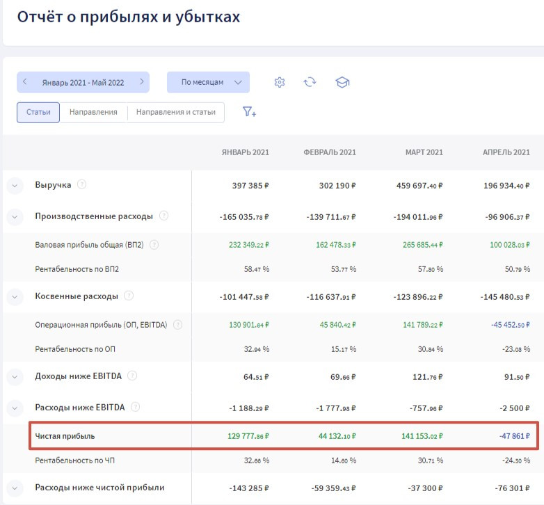 В Финтабло зарплата по всем сотрудникам указана в специальном разделе. Владельцы получают дивиденды от своего дела. Для этого оно и нужно. Вот только выплата дивидендов — довольно сложный процесс, так как приходится учитывать много нюансов. Если не следовать правилам и вынимать средства из бюджета хаотично, это может привести к проблемам, в том числе дефициту средств на счетах, кассовым разрывам и долгам. Дивиденды — это часть прибыли, которая причитается собственникам. Если владелец один, то дивиденды положены только ему. Если это акционерное общество и собственников несколько, то дивиденды выплачиваются всем держателям акций. Формально процесс выплаты называется распределением прибыли. Дивиденды рассчитываются на основе чистой прибыли, то есть после вычета всех расходов, включая налоги. Подробнее узнать, как считать чистую прибыль и какая для этого нужна отчётность, можно в статье. «Можно отметить два преимущества для организации, когда её владелец получает дивиденды. Во-первых, регулярная выплата дивидендов помогает привлечь новых инвесторов и акционеров, которые ищут стабильный и надёжный источник дохода. Это может увеличить капитализацию компании и обеспечить дополнительные средства для роста и развития. Во-вторых, выплата дивидендов помогает оптимизировать капитальную структуру компании. Это позволяет организации эффективно управлять своими финансами и использовать долгосрочные и краткосрочные источники финансирования». Екатерина Яхонтова, финансовый директор Дивиденды приносят уже состоявшиеся бизнесы, от стартапов их ждать не стоит: лучше вкладывать все свободные средства в развитие. Если хочется получать деньги сразу, лучше обратить внимание на вариант с зарплатой или смешанный. Ситуации, когда дивиденды выводить не стоит В Финтабло проверить чистую прибыль можно в Отчёте о прибылях и убытках. Особенности выплаты дивидендов О том, как выводить дивиденды правильно и не вызвать подозрения у налоговой, читайте в блоге Финтабло. Рассчитаем сумму дивидендов и налоговую нагрузку на примере. Пример. Возьмем уже знакомого нам Валерия, который изготавливает уличные тренажёры. Прибыль компании до налогов — 50 млн руб. в месяц. Валерий хочет получать каждый месяц около 1 млн руб. Итого — 12 млн руб. в год. Пусть теперь это будут дивиденды. Посчитаем расходы предприятия и посмотрим, что выгоднее. НДФЛ рассчитывается так же, как и с заработной платы: 13 % от суммы до 5 млн руб., 15 % от суммы свыше 5 млн руб. 5 000 000 × 13 % = 650 000 руб. 7 000 000 × 15 % = 1 050 000 руб. НДФЛ итого: 650 000 + 1 050 000 = 1 700 000 руб. Валерий получит на руки: 12 000 000 − 1 700 000 = 10 300 000 руб. Рассчитаем налоговую нагрузку на предприятие и сколько денег останется на развитие. Налог на прибыль: 50 000 000 × 20 % = 10 000 000 руб. Всего налогов: 10 000 000 + 1 700 000 = 11 700 000 руб. На развитие компании с учётом дивидендов останется: 50 000 000 − 11 700 000 − 10 300 000 = 28 000 000 руб. Напомним, что при выплате заработной платы директору на развитие осталось 30 819 506,6 руб. Получается, что платить зарплату директору выгоднее, чем начислять дивиденды. Но сам размер выплаты при этом меньше — 8 202 467 руб. на руки. Поэтому, когда финансовое состояние организации позволяет, можно сделать выбор в пользу дивидендов или смешанного варианта. О нём расскажем ниже. Дивидендами могут быть не только денежные средства, но и имущество. Например, компан