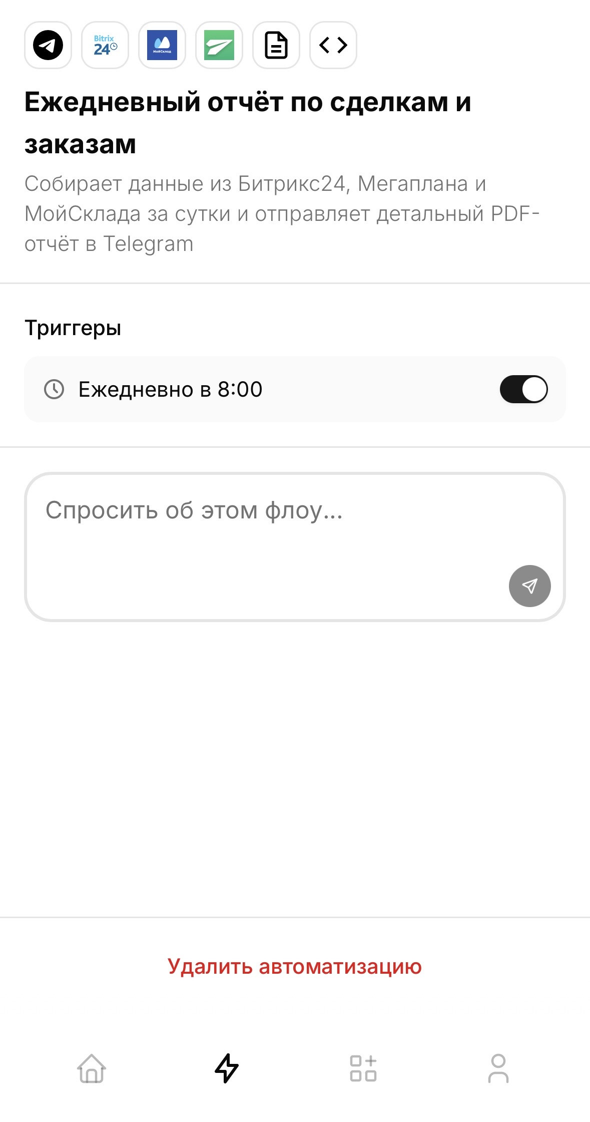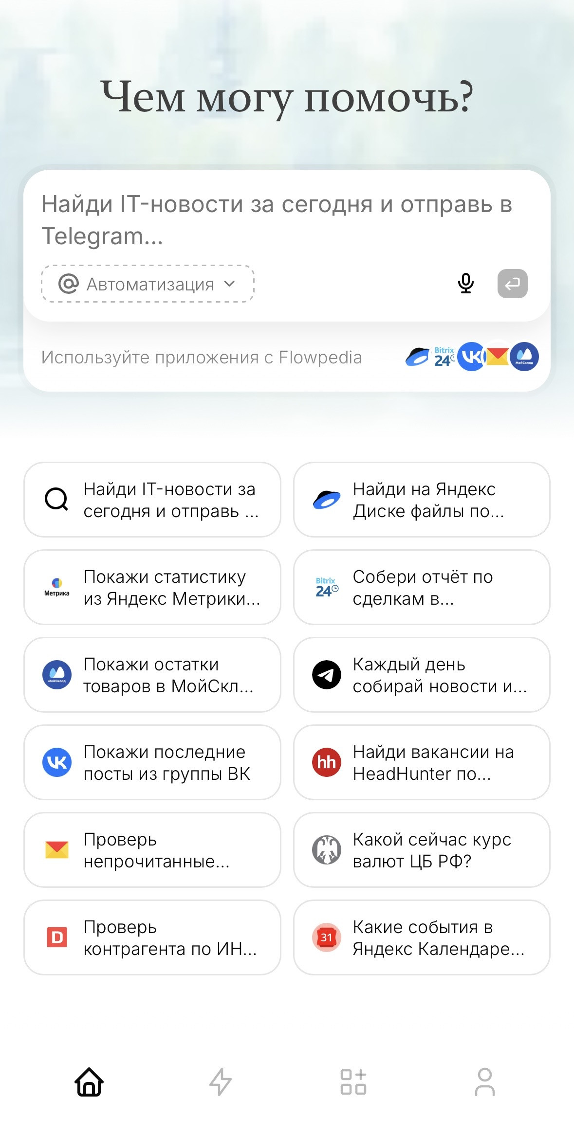 Здесь видны все ваши автоматизации: что делают, когда запускаются, активны или на паузе. Пример самой частой автоматизации — сбор аналитики из CRM систем и отправка туда, где вам удобно будет читать. Приведу пример работы — дайджест по входящей почте в телеграм Flowpedia работает с сервисами которыми вы уже пользуетесь: Яндекс (Диск, Почта, Метрика, Календарь), Битрикс24, МойСклад, Телеграм, ВКонтакте и другие. Подключение занимает пару кликов — авторизуетесь и готово. Для предпринимателей, менеджеров, маркетологов — всех, кто работает с информацией из разных источников и устал делать одно и то же каждый день. Не нужно быть программистом. Если можете объяснить задачу человеку — можете объяснить её нашему ассистенту. Будем рады обратной связи — напишите в комментариях что думаете, какие сервисы используете в работе и что хотели бы автоматизировать. Это поможет нам сделать продукт лучше.
