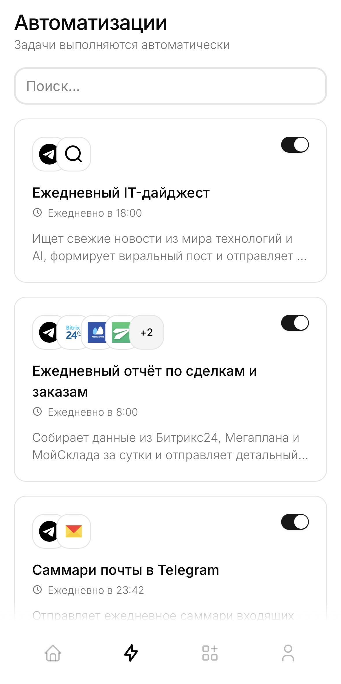 Разовые задачи — это хорошо, но настоящая сила в автоматизациях. Настроили один раз — работает каждый день.