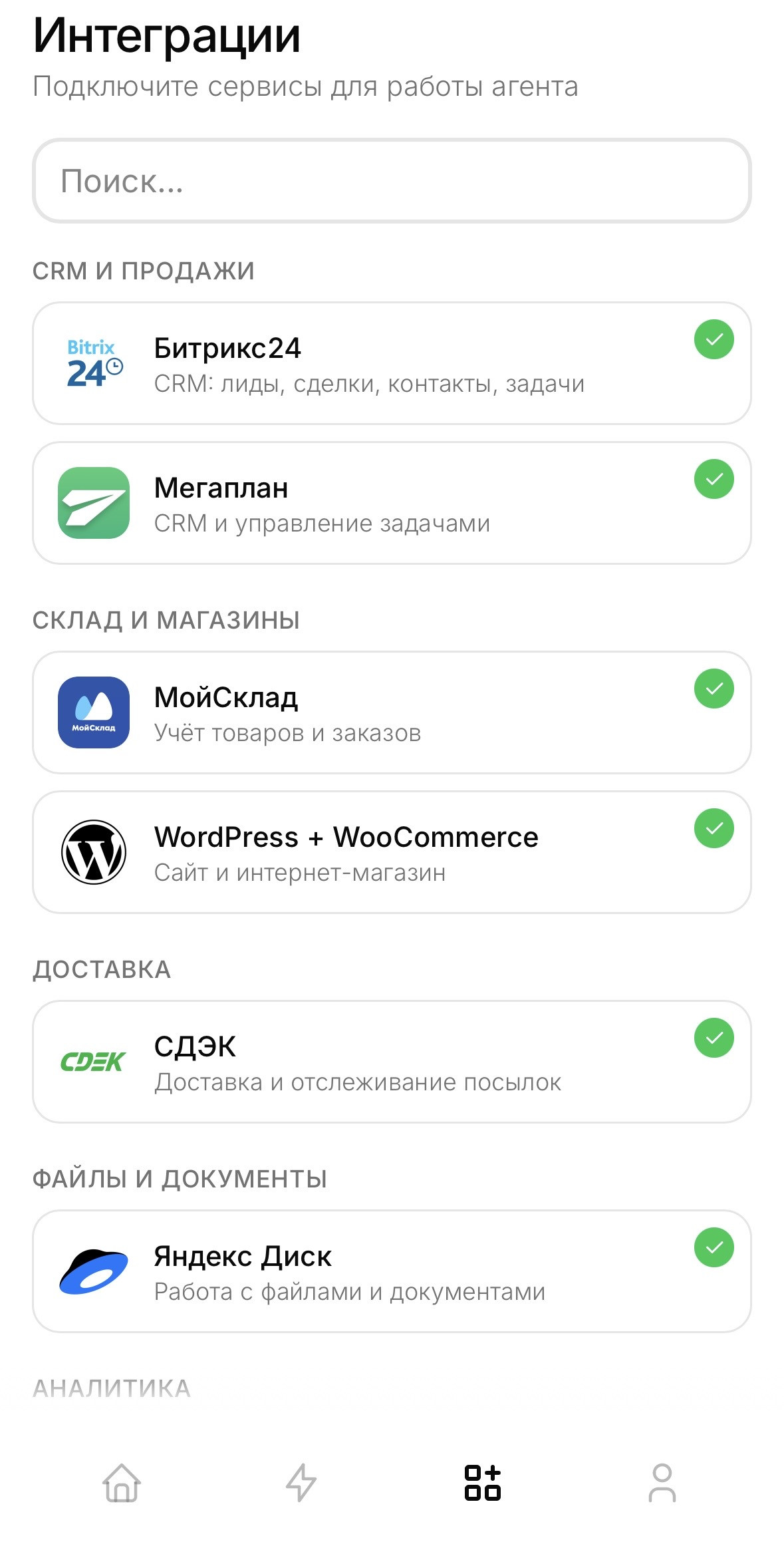 Главный экран — обычный чат. Пишете что нужно, ассистент выполняет. Внизу — примеры частых запросов для быстрого старта.