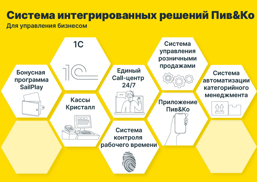 Основа бизнес-модели сети — быть сервисной компанией и предлагать покупателям востребованный, вкусный и доступный продукт. Исходя из этой глобальной цели, компанией были развернуты полноценные системы, многие из которых являются уникальными разработками IT-специалистов "Пив&Ко«.Первый серьезный шаг навстречу клиенту, который был сделан несколько лет назад, — бонусная система SailPlay, полностью заточенная под нужды розницы «Пив&Ко». История каждого клиента сохраняется и анализируется в системе, подключенной к 1С, благодаря чему маркетинг компании может детально работать с персонализацией в части предложений, акций и обратной связи. Кроме того, многие процессы коммуникации с покупателями в программе автоматизированы. Все покупатели сегментированы на десятки групп, и с помощью детально проработанного RFM-анализа система сама принимает решение, когда и какому покупателю отправить то или иное предложение, чтобы простимулировать покупку.Единый круглосуточный многоканальный call-центр, в котором клиентам отвечает живой человек, — это сейчас большая ценность. Плюс данные с помощью интегрированного стороннего сервиса собираются со всех отзовиков и консолидируются в 1С. Одна из последних масштабных разработок компании — собственное мобильное приложение. Преимущества приложения для покупателей, которые мотивируют скачать его и использовать: личная бонусная карта в телефоне, кэшбек до 8% с каждой покупки и повышенный кэшбек до 50% на три категории товаров, которые можно самостоятельно изменять раз в месяц, связь со службой поддержки сети 24/7 и возможность оценивания товаров и сервиса за повышение статуса карты, игра «Колесо Удачи» и карта с адресами магазинов.Для маркетинга компании данное приложение — мощный инструмент для улучшения сервиса и ассортимента магазинов. Как же работает система оценок в приложении: покупатель ставит оценку за скорость и качество обслуживания, чистоту в магазине, плюс выставляет оценки всем продуктам, которые были в чеке. Если есть желание, то может и оставить полноценный отзыв. Все это в режиме 24/7 отслеживает call-центр сети. Если пришел негативный отзыв — оператор вникает и индивидуально решает проблему. Если требуется вовлечение других сотрудников компании — передает задачу ответственным за данное направление.Благодаря интеграции приложения с 1С — базовой программой управления бизнесом «Пив&Ко», все данные хранятся и анализируются в удобном виде. В 1С настроено около сотни автоматических ежедневных и еженедельных отчетов для топ-менеджмента компании, руководителей подразделений и линейных специалистов — для каждого свой формат. Это позволяет оперативно работать с обратной связью, понимать уровень удовлетворенности покупателей и влиять на него на качественно новом уровне. Еще один шаг в плане повышения сервиса — внедрение нового кассового ПО Set Retail 10 компании «Кристалл». Программа централизованно управляет кассами в магазине, группе магазинов и всей сети — от настроек и обновлений до системы лояльности и операционного дня. Важно, что новое ПО позволило сократить время обслуживания клиентов на 30 секунд. Для этого компания провела целый комплекс мер: заменила кассовое оборудование, ускорила работу ПО, улучшила интерфейс касс, чтобы продавцам было удобнее работать. В результате кассы те
