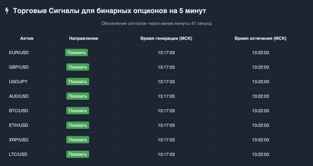 - Совместимость — возможность использовать сигналы с популярными брокерами: PocketOption, IQ Option, Olymp Trade и другими.