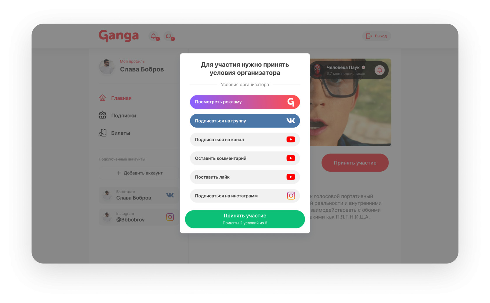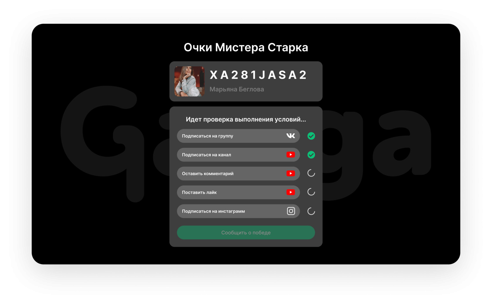 Забудьте о тех днях, когда приходилось проверять выполнение условий для каждого победителя во всех соцсетях вручную. За вас это сделает Ganga в автоматическом режиме. Если участник не выполнил одно из условий, начинается поиск следующего победителя.