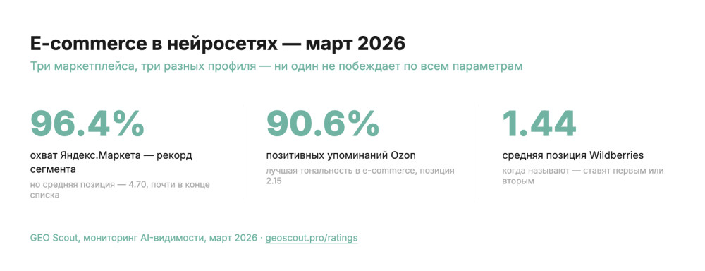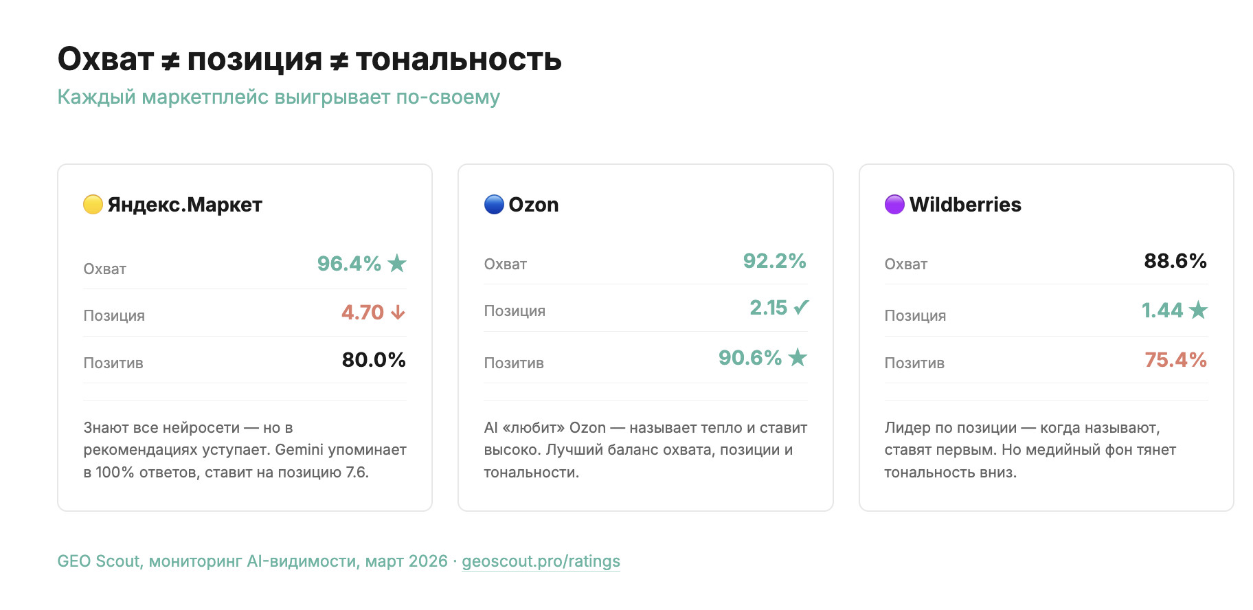 Для продавцов это означает: выбор платформы влияет на AI-видимость товара. Продавец на Wildberries с большей вероятностью получит упоминание в ответе нейросети, чем продавец на Яндекс.Маркете при прочих равных.
