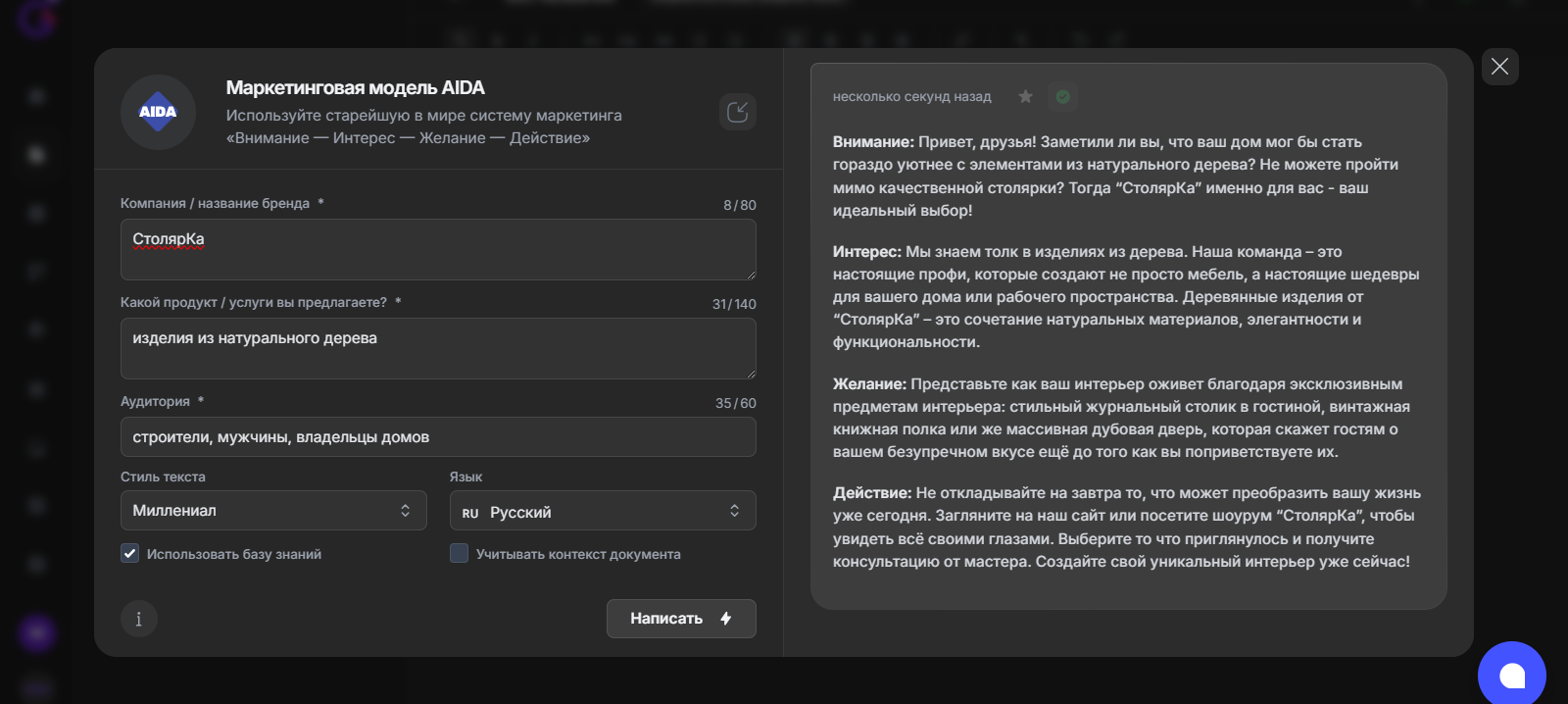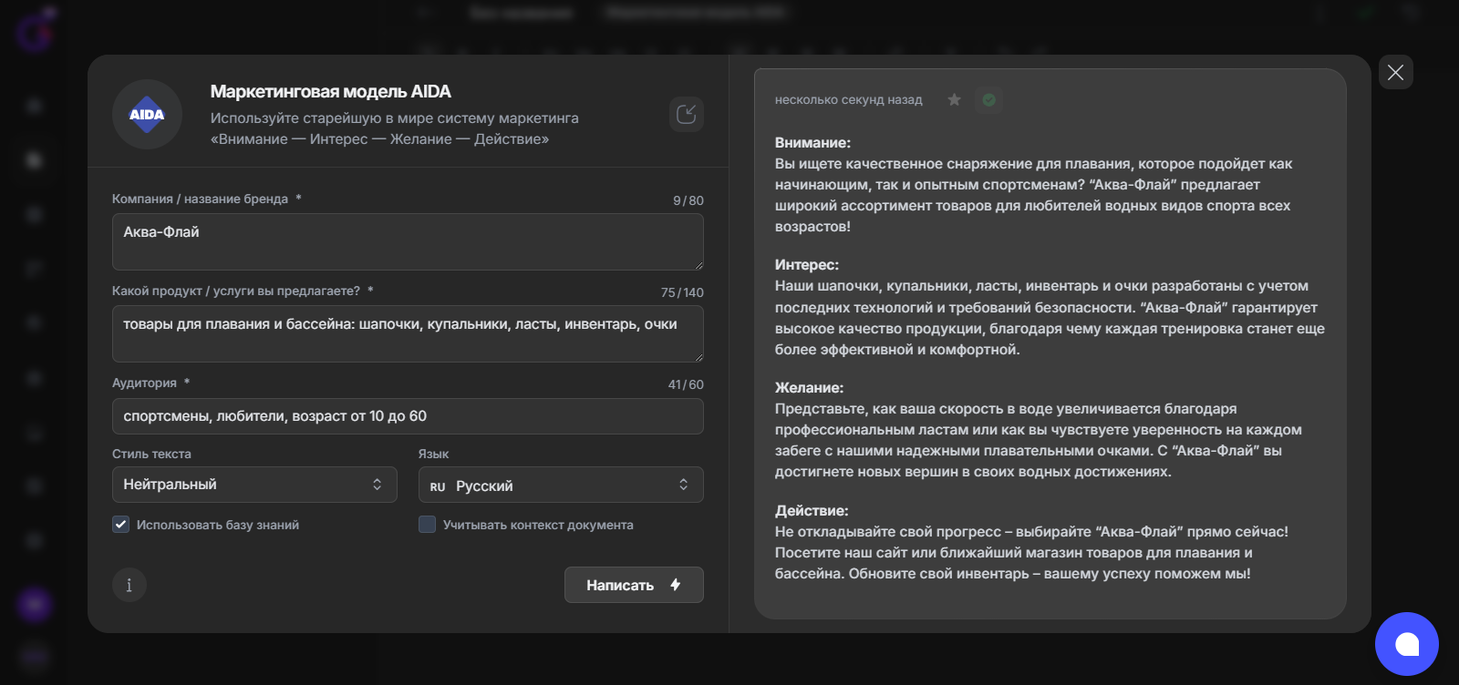 Первый этап включает в себя таргетированную рекламу, СЕО-оптимизацию, маркетинг, рекламу на билбордах, афишах, в постах — цепляющий заголовок, интересное фото или завлекающее видео с учетом целевой аудитории справятся с этим. 2 этап — Интерес Сейчас важно вызвать интерес у читателя и оставить его на странице сайта или блога надолго, чтобы довести действие формулы до конца. Когда потенциальный клиент уже отметил, что заголовок или превью ему понравились, надо сказать о достоинствах продукта и его характеристиках. Перечислите те задачи, которые можно будет решить с помощью вашего товара, назовите выгодные условия или тарифы, акции. Например, вы продаете онлайн-курсы. На что стоит обратить внимание на втором этапе? 3 этап — Желание На этапе № 3 важно, чтобы уже заинтересованный клиент изъявил желание приобрести продукт. Здесь вам нужно показать потенциальному покупателю, как ему сильно нужен товар и насколько его жизнь изменится с приобретением. Если вы по-прежнему продаете онлайн-обучение, то на данном уровне обозначьте: Все ваше взаимодействие с невидимым клиентом должно строиться на доверии и честности. Не забывайте: если клиент потеряет доверие, то все предыдущие этапы были бессмысленны. 4 этап — Действие На 4 этапе помогаем клиенту действовать и обозначаем для него простые шаги, выполнив которые, он сможет стать обладателем товара. Вы можете предложить заполнить форму для брони — менеджеры перезвонят и подтвердят его заказ, а также оставить адрес электронной почты для получения подробной информации, заполнить анкету, ответить на пару уточняющих вопросов, воспользоваться скидкой и любые другие действия, которые предполагает ваш бизнес. Главное: коммуникация с покупателем должна быть выстроена точно и понятно, иначе человек может «слиться» на данном этапе из-за сложности требуемых действий и недостатка информации. Преимущества модели AIDA: Давайте рассмотрим пример использования формулы AIDA на сервисе генеративного контента Gerwin. Для этого на панели управления в личном кабинете мы выбираем раздел «Шаблоны» и далее нажимаем «Фреймворки». Заходим в раздел «Маркетинговая модель AIDA». Например, вы — компания, продающая товары для плавательного спорта. Заполняем разделы, отмеченные звездочкой и выбираем стиль написания (мы выбрали «Нейтральный»). Онлайн-сервис Gerwin примерно так предлагает реализовать формулу AIDA через текст. Вы можете использовать рекомендации в слайд-версии, например, сделать карусель картинок и вставить текст. Не забывайте, что информация должна идти по порядку и постепенно: крайне нечитабельно и непривлекательно выглядит перенасыщенный текстовым содержимым слайд в ленте новостей. Попробуем создать маркетинговую модель AIDA для столярной студии, например. На этот раз был выбран более интересный и смелый стиль, текст превратился в литературный вариант рекламной статьи. Вы, разумеется, добавите информацию и, на свое усмотрение, красиво оформите вашу маркетинговую кампанию. Большинство рекламных роликов по телевизору, радио и в интернет-пространстве выполнены по принципу AIDA. Даже если вы прямо сейчас включите телевизор, наверняка первая попавшаяся реклама сначала привлечет ваше внимание чем-то наподобие: «Не хотите больше болеть?» И зритель сразу понимает, что эта информация прямо для него. И далее по с