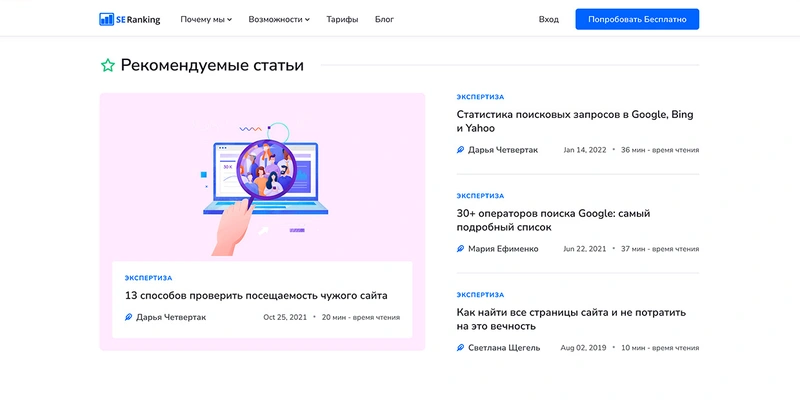 Здесь вы найдете не только новости о СЕО, но и подробный анализ индустрии маркетинга, сложности поисковых систем, а также сможете проследить постоянно меняющийся ландшафт онлайн-видимости. Вам будет проще разобраться со сложными алгоритмами и освоить поисковый маркетинг. Cпециализируется на мире поисковой оптимизации, социальных медиа и цифрового маркетинга. Здесь есть все новости и экспертные заключения, чтобы люди могли проще ориентироваться и отслеживать изменчивый мир SEO. Подробные обсуждения и возможность окунуться в мир СЕО. Платформа с самым высоким рейтингом. Она способна автоматизировать рутинные задачи для составления дальнейшего анализа. Блог доступен на русском языке. На сайте можно найти советы и предложения по разработке приложений, функционированию соцсетей и голосового поиска. Широкий спектр тем поможет быстро сориентироваться в мире маркетинга и поисковой оптимизации. Все о продвижении сайта и не только: новейшие инструменты для анализа изменений поисковых систем. Блог с примерами из жизни, основываясь на которых вы можете получить неплохой урок и даже онлайн-опыт. Здесь собран исключительно полезный контент и множество четких советов по оптимизации. Сайт для тех, кто хочет быть в тренде и понимать, что делает блоги и страницы востребованными. Как видео влияет на поисковый маркетинг или почему наш блог еще не в топе? На эти вопросы можно поискать ответ на страницах данного сайта. Блог для желающих оптимизировать веб-сайт. На онлайн-страницах блога можно найти много полезных материалов по улучшению сайта и поднятию его в топе. Есть платная версия, которая предполагает массу новых возможностей: постоянную поддержку, отсутствие рекламы и многое другое. Информативный блог о контент-маркетинге и СЕО-процессах. Помощники в бизнесе. Они гарантируют бесплатный SEO-аудит, размещают информацию из индустрии локального и мобильного поиска. Мегаполезный блог обо всех изменениях в поисковой выдаче Google. Здесь публикуют всю информацию о поисковом роботе, об изменениях официального алгоритма и массу актуального, особенно для вебмастеров. Рекомендуем просмотр именно на английском языке, т.к. русскоязычная версия может не обновляться в данный момент. Блог соучредителя журнала WIRED. Он дает умные советы, основанные на собственном богатом опыте в сфере SEO и смежных отраслях. Это, своего рода, сообщество контент-маркетологов, пиарщиков и других специалистов в сфере контента. Здесь они могут делиться опытом, давать советы, рассказывать истории из жизни и получать много знаний по сторителлингу, ведению соцсетей и не только. Уникальный блог, посвященный текстам. В SEO-копирайтинге огромную роль играет посыл, идея, структура текста и еще множество факторов. Разобраться в ценности текста, получить современные навыки написания и воздействия на аудиторию словом можно в этом блоге. Блог создан при участии нескольких авторов. Он затрагивает большой спектр разных тем и вопросов, которые так или иначе касаются маркетинга. Интересные сведения, анализ тенденций, стратегий в области поисковых систем. Здесь предложены статьи, кейсы, интервью и другие форматы. Чтобы не потерять подборку — добавляйте ее себе в документы, закладки или просто «мотайте на ус». Пробуйте изучать разные источники и искать подходящие вам, для работы, хобби 