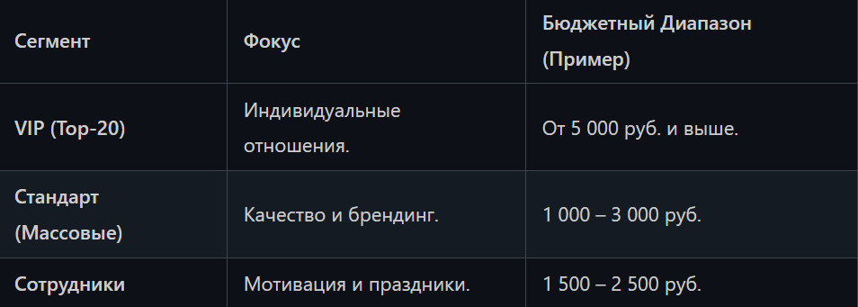 Нельзя дарить одинаково. Разделите аудиторию на группы, чтобы бюджет работал точечно: Чтобы избежать «кассовых разрывов» в декабре, распределите бюджет по трем корзинам: Планирование по кварталам позволяет вам успеть занять лучшие производственные мощности и избежать ажиотажных цен. 23 Февраля / 8 Марта: Современный подход: отказ от стереотипов. Дарите полезный опыт или качество, которое видно сразу. Для женщин — подписки на медитацию или нишевая косметика. Для мужчин — гаджеты для хобби или премиальные аксессуары для путешествий. Подарок — это 30% успеха. Остальное — это подача и контекст. Не дайте логистике и упаковке украсть ваш бюджет: Чтобы подарок работал как часть вашей коммуникации, добавьте умное послание: Годовое планирование корпоративных подарков в 2026 году — это переход от хаотичных трат к стратегической инвестиции. Вы получаете лучшее качество по лучшей цене, одновременно укрепляя отношения с ключевыми людьми вашего бизнеса. Начните сегодня: проанализируйте, что сработало в прошлом году, зафиксируйте ключевые дедлайны по срокам заказа и сделайте первый шаг к спокойному и успешному подарочному сезону 2026!