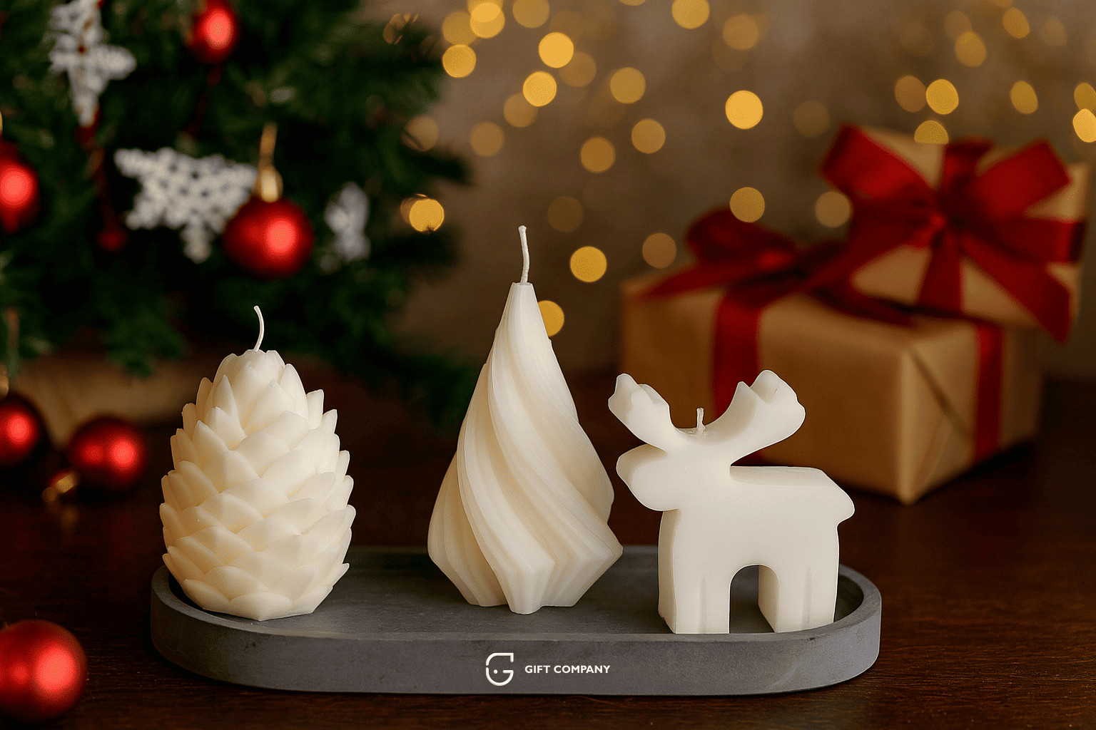 Например, набор из трех свечей в форме елки, оленя и шишки. Все они выдержаны в спокойном молочном цвете и стоят на подставке из бетона. Выглядит как законченная композиция, которую не хочется прятать в шкаф.