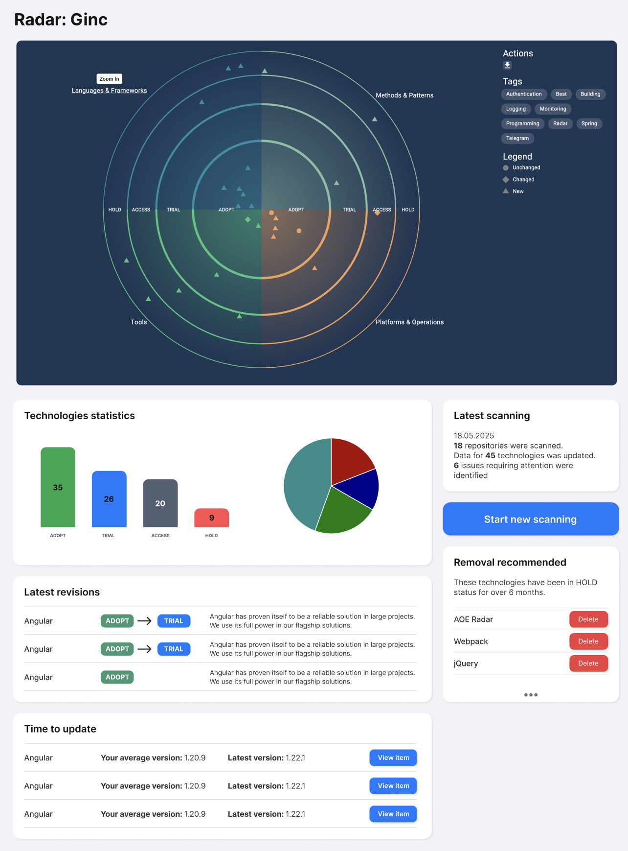 Дальше начинается «магия» классификации. Собранные данные разбиваются по понятным категориям: frontend, backend, DevOps, базы данных. Ginc Radar сопоставляет версии каждой технологии с актуальными, выявляя устаревшие компоненты, и даже распознает «технологии-зомби» — те, что формально есть в коде, но давно заброшены и несут скрытые риски.