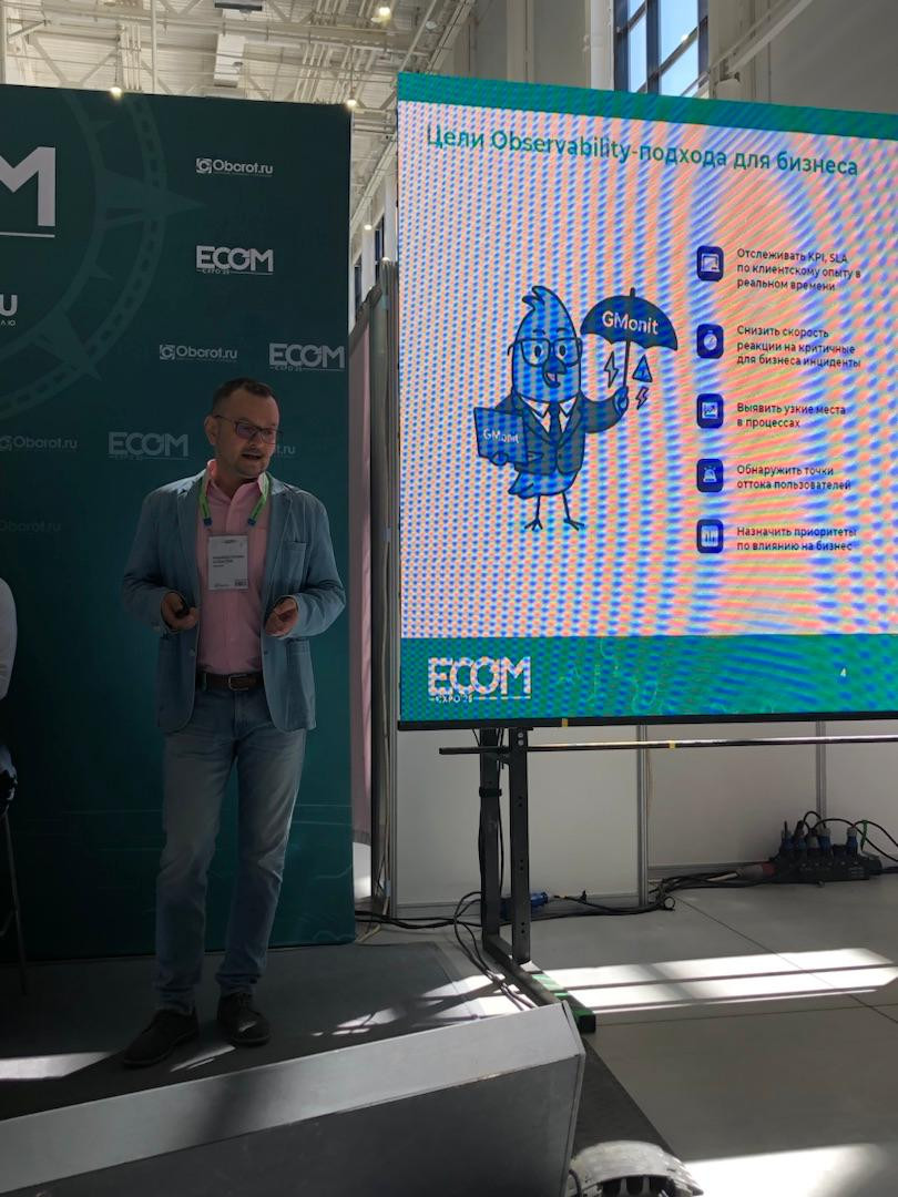 Аккаунт-директор GMonit Алексей Хамидуллин выступил с докладом в секции «Лоскутное превосходство. Как собрать свою экосистему из решений и внешних экспертов в е-коме». Эксперт рассказал, как построить мостик от ИТ-метрик к бизнес-ценностям, объяснил цели Observability-подхода и перечислил преимущества централизованного сбора и анализа метрик. Слушатели узнали, как наблюдаемость позволяет принимать обоснованные бизнес-решения, повышать выручку за счет сокращения времени на устранение инцидентов и ускорять выпуск новых релизов.