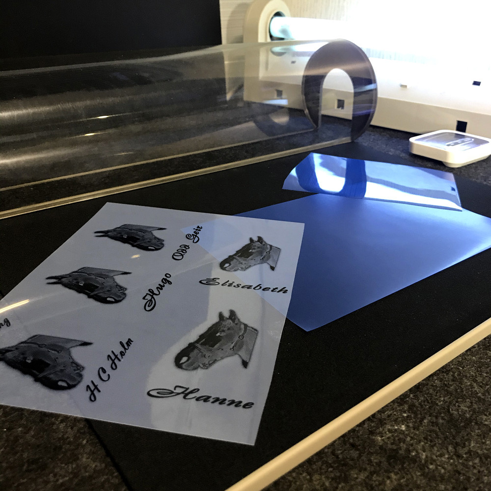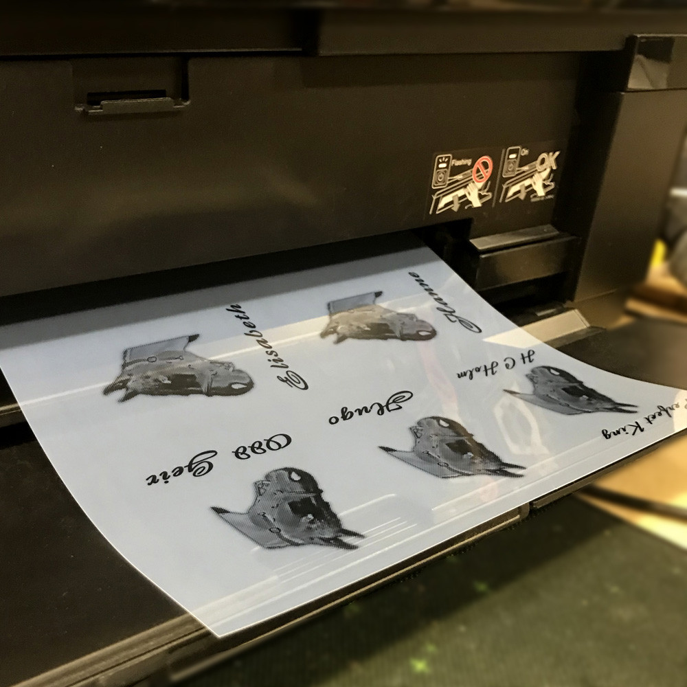 Первым делом нужно подготовить макет в ФШ для гравировки, после чего его распечатать. Далее нужно сделать оттиск готового макета на специальной пленке Photo Rayzist SR3000, делается это освещением ультрафиолетовой лампой, и промывается водой, получается своего рода трафарет.