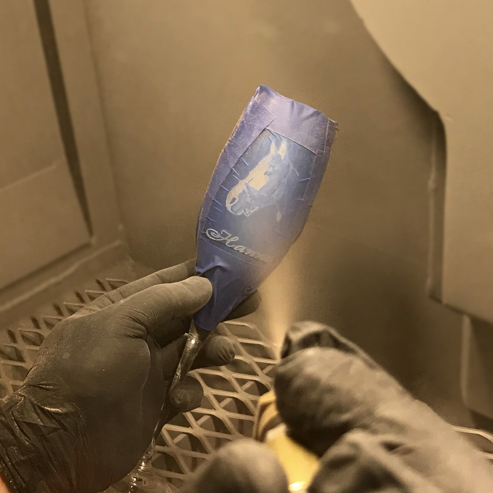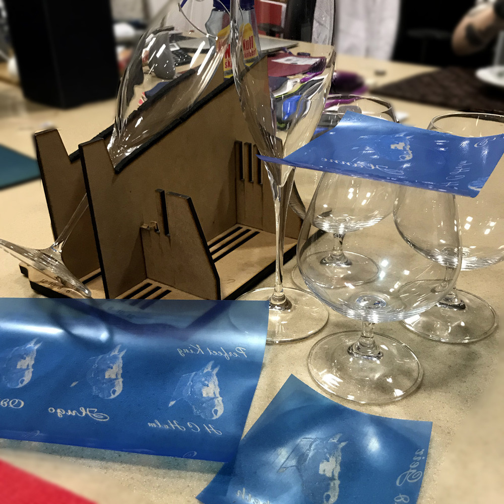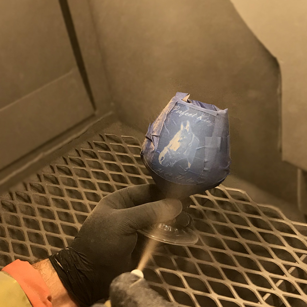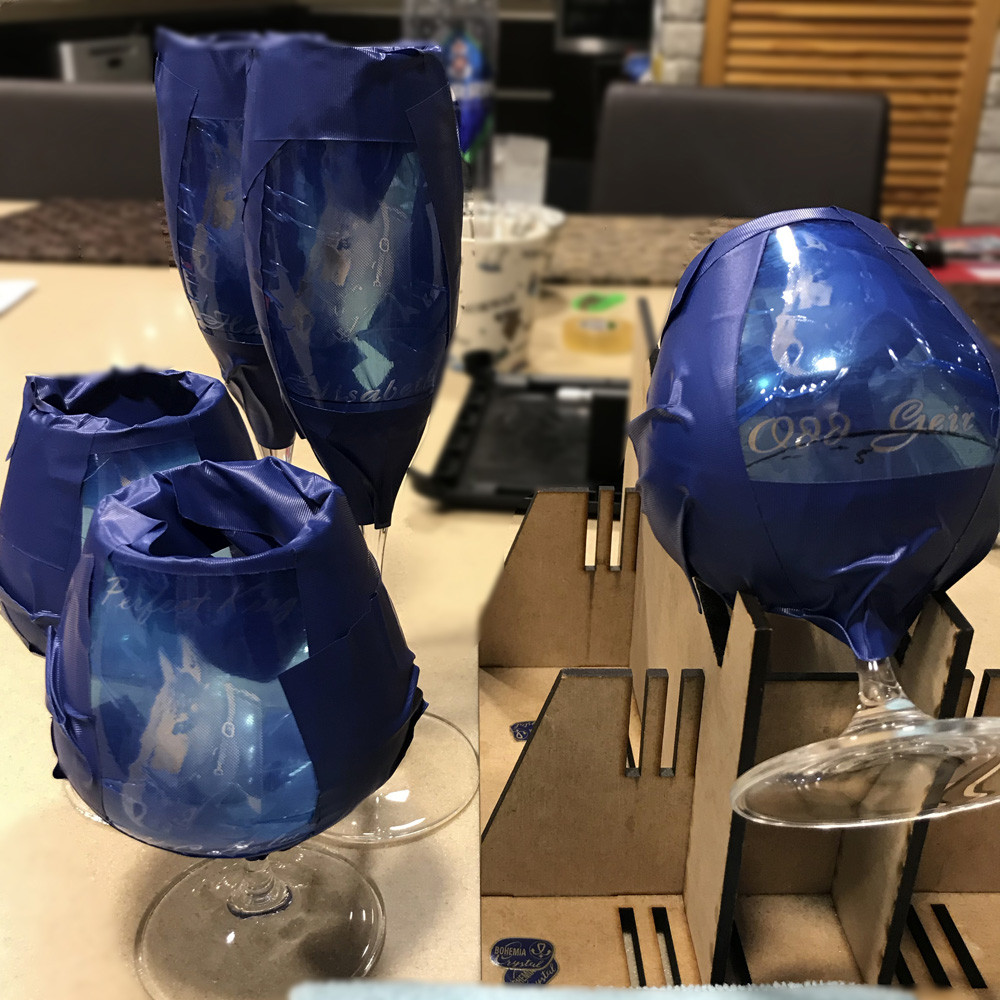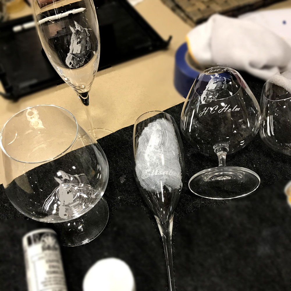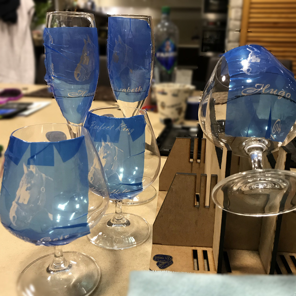 Это самый сложный этап для меня, так как нужно аккуратно и ровно разместить пленку на бокале, и закрыть все части бокала, которые не будут гравироваться. Этап 4: Гравировка В специальных перчатках производится гравировка под струей воздуха с песком, аккуратно нужно проходить по тем местам, которые должны быть выгравированы. Этап 5: Мойка/сушка/полировка После нанесения гравировка, нужно естественно снять все защитные пленки, очень тщательно промыть, высушить и отполировать. Этап 6: Фотосъемка/упаковка/отправка Я обязательно делаю фото готовой продукции и отправляю её клиенту что бы тот убедился в качестве выполненной работы. Если клиент дает разрешение на размещение материалов на моём сайте — https://gravira.lt/ , размещаю в портфолио=) После чего очень осторожно упаковываю бокалы (даже почта России не сможет их разбить), и отправляю бокалы службой доставки.