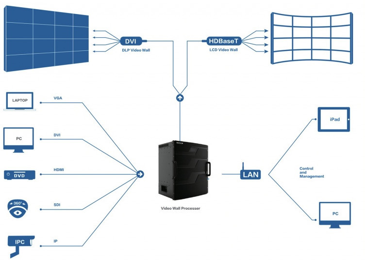 Задача контроллера видеостены заключается в объединении жк панелей в большой экран для одновременного вывода окон с видео, изображением, текста (больше, чем модулей в видеостене).