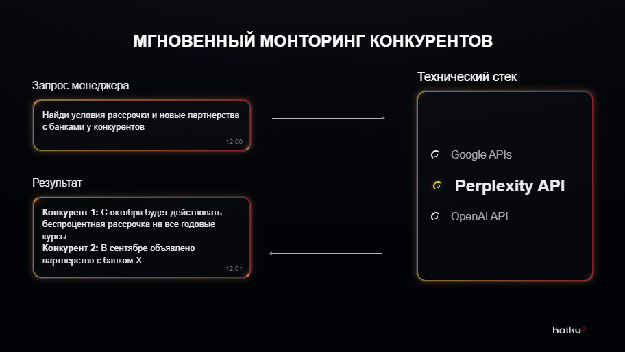 Компания перестала «догонять» рынок. Стратегические и маркетинговые решения теперь принимаются на основе свежих данных, а не ретроспективных обзоров. Если вы чувствуете, что конкурентный ландшафт меняется быстрее, чем успевает реагировать ваша команда, используйте ИИ-агентов или готовые системы для решения этой задачи. Важно выстроить процесс, который обновляет информацию ежедневно, без ручного труда и с нужным уровнем детализации. Если вы видите похожую задачу у себя — мы готовы показать, как она решается на практике. Напишите мне на почту sergey.ershov@haiku.dev или в Telegram @Ershovsa. Проведём демо и обсудим вашу ситуацию. Haiku внедряет ИИ-решения, которые органично вписываются в корпоративные процессы, соответствуют требованиям безопасности и масштабируются вместе с вашим бизнесом.