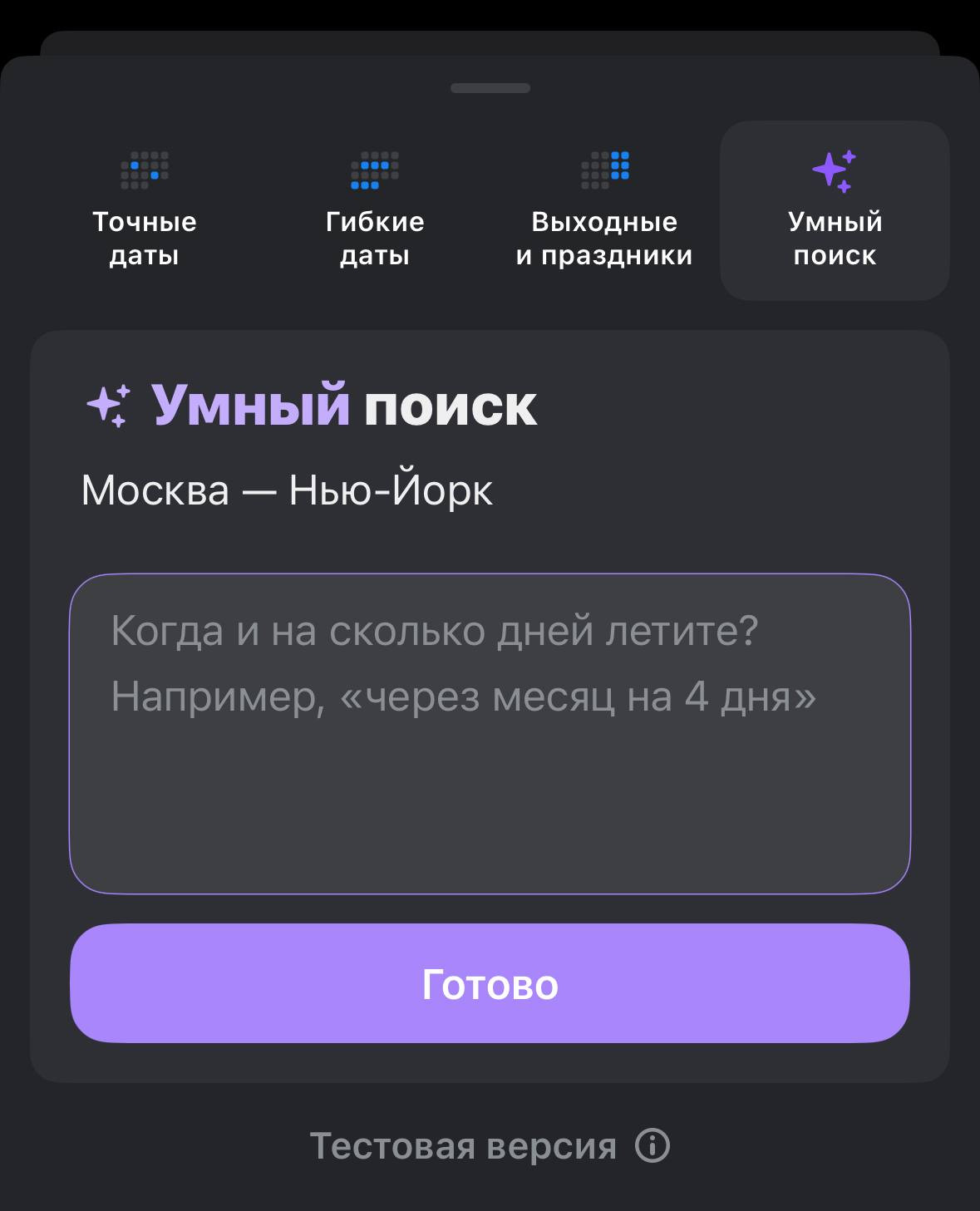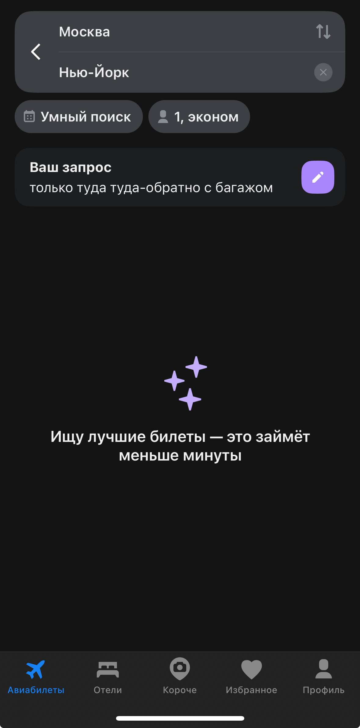 ИИ-поиск на базе Aviasales позволяет пользователю задавать поисковый запрос в естественной форме, указывая города и даты, нужен ли багаж, сколько дней, направление отдыха.