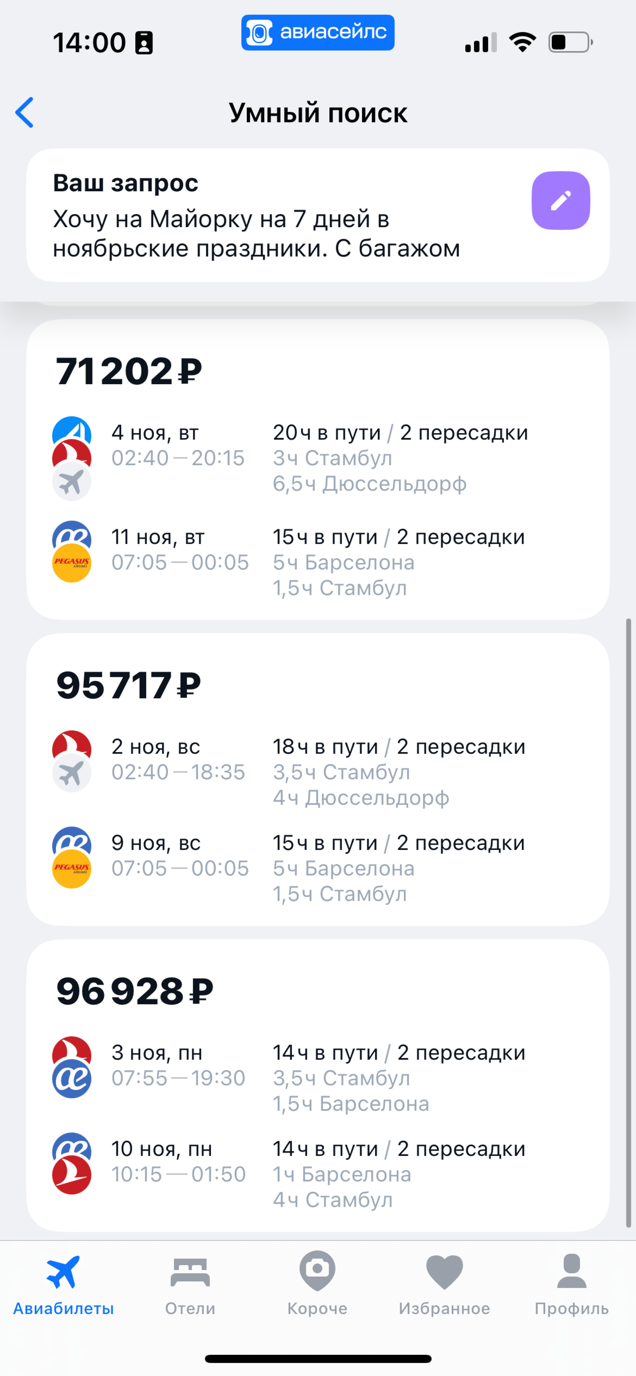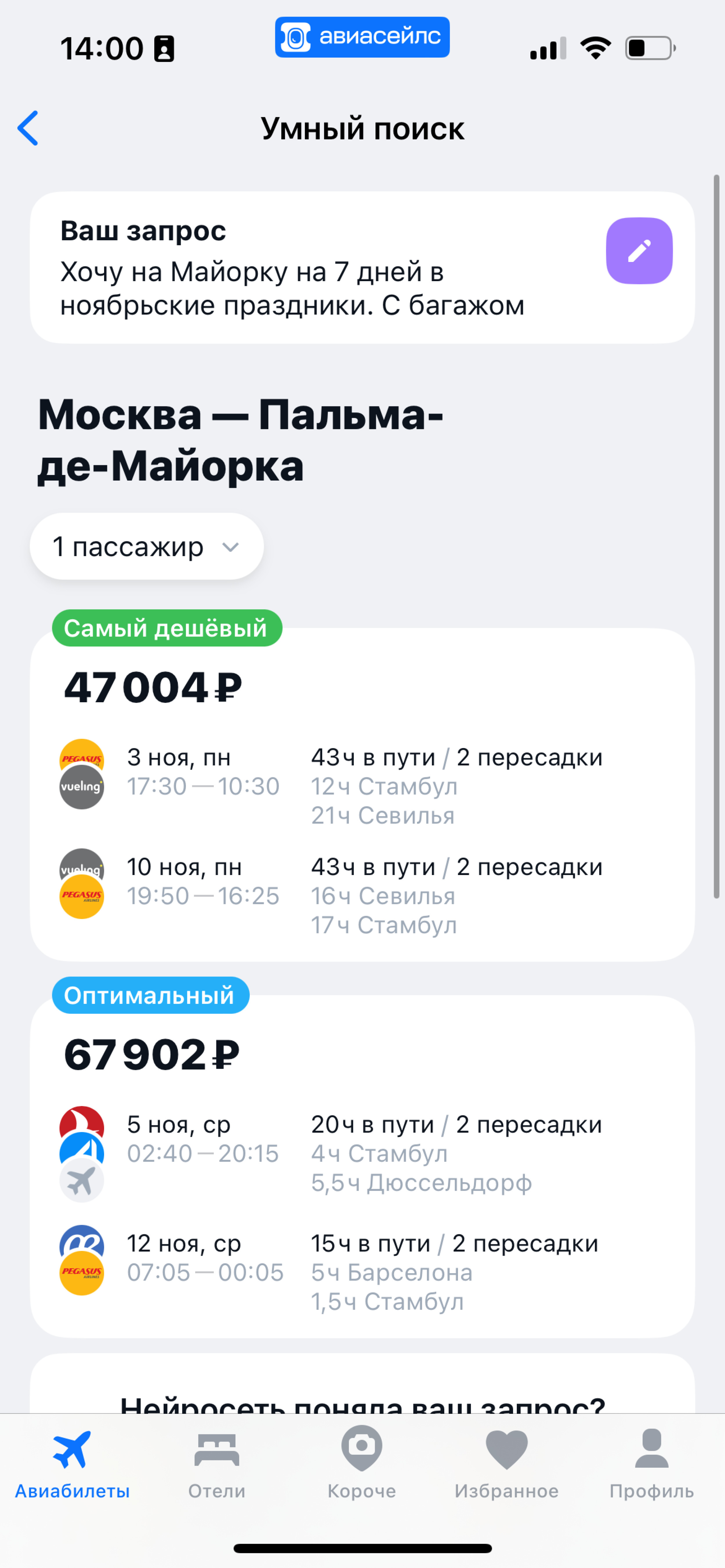 ИИ-алгоритмы перебирают сотни вариантов и возвращают только те, что соответствуют всем условиям. Например, по запросу «Хочу на Майорку на 7 дней в ноябрьские праздники с багажом» ИИ-поиск выдал 5 вариантов: все рейсы — «Москва — Пальма-де-Майорка», продолжительность ровно 7 дней в диапазоне дат с 2 по 12 ноября, багаж предусмотрен.