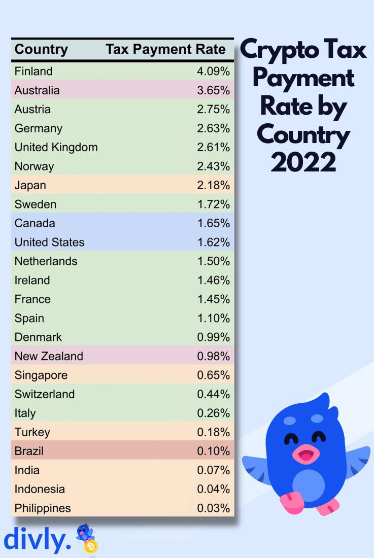 В США, которые могут похвастаться самым большим в мире количеством пользователей криптовалют, ставка налога составила всего 1,62%. Такой низкий уровень налоговых платежей за криптовалюту во всём мире является результатом множества факторов. В Divly утверждают, что осведомлённость общественности о требованиях к отчётности о криптовалютах часто неясна для большинства пользователей. В компании также отметили, что более высокие показатели, зарегистрированные в Японии и Германии, могут быть результатом усиления государственного правоприменения, а также повышения доступности налоговых калькуляторов и других услуг. Глобальное стремление ввести более чёткие налоговые правила может привести к значительному увеличению налоговых платежей на криптовалюту уже в 2023 году. Новости и заметки о криптовалютных и традиционных финансовых рынках, политике и технологиях в Телеграм.