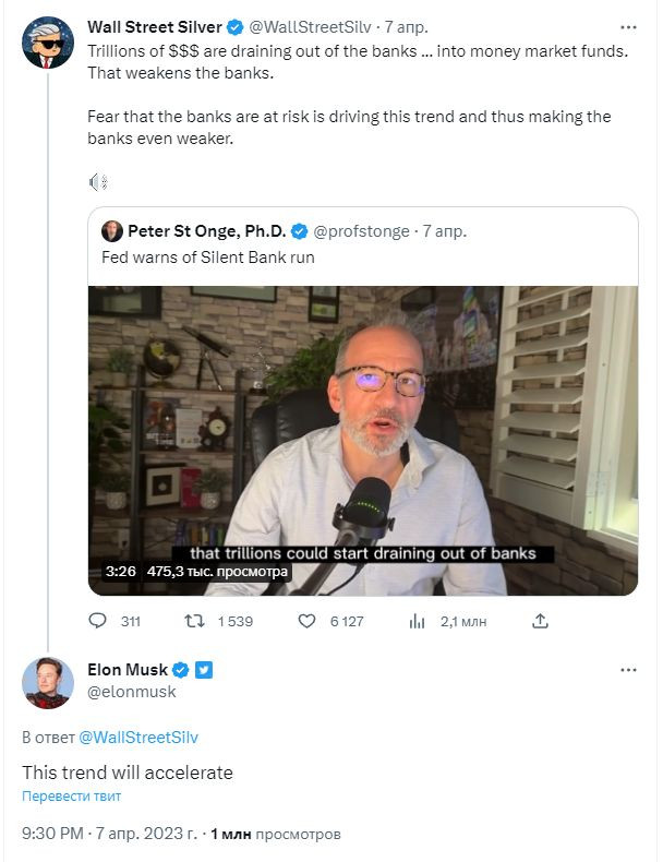 Данные Федеральной резервной системы США разве что отсылают нас к 1973 году, с учётом того, что за последние две недели марта 2023 года банковское кредитование уменьшилось почти $ 105 млрд. Как поясняет специалист Bloomberg Александр Танци, кредиты состояли из промышленных, коммерческих и ипотечных кредитов. Кроме того, на прошлой неделе депозиты коммерческих банков сократились на сумму $ 64,7 млрд, что ознаменовало 10-е подряд недельное снижение. Экономист Питер Сент-Ондж объяснил, что значительная часть банковских депозитов перемещается на счета денежного рынка: Триллионы долларов утекают из банков... в фонды денежного рынка. Это ослабляет банки. Страх того, что банки небезопасны, движет этой тенденцией, и делает их ещё слабее. Видеоролик экономиста прокомментировал владелец компании Tesla Илон Маск: «Эта тенденция будет ускоряться».