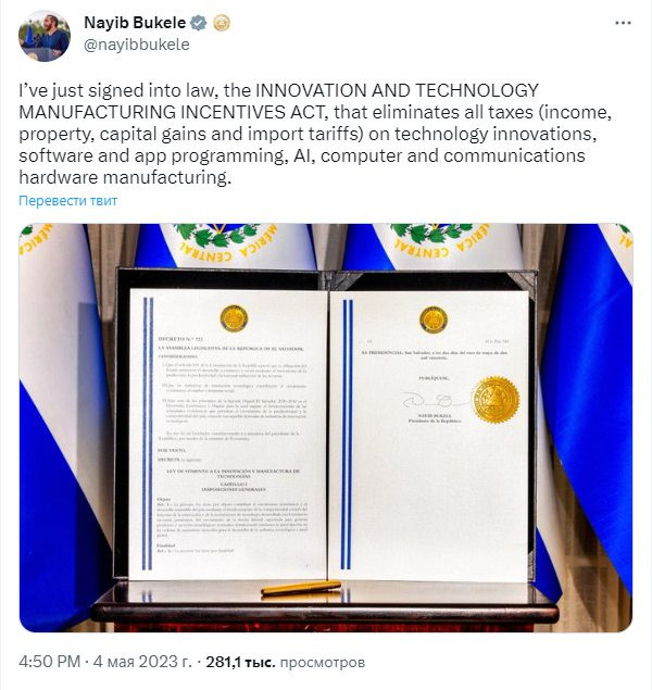 Сегодня президент Сальвадора Найиб Букеле подписал закон об отмене налогов на технологические инновации. Этот шаг укрепляет позиции Сальвадора в качестве страны для развития технологий.