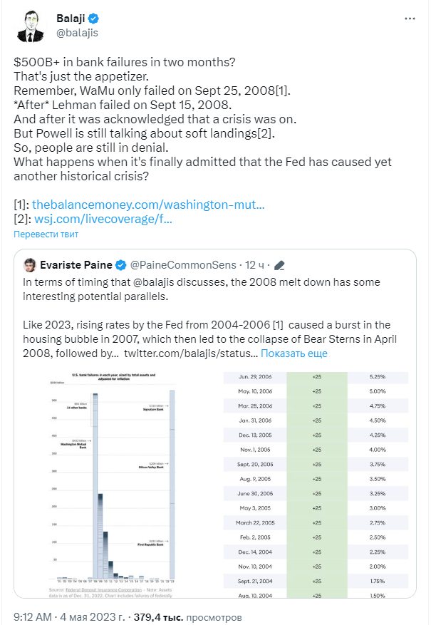 Бывший технический директор криптобиржи Coinbase Баладжи Шринивасан говорил, что недавние банкротства банков могут быть лишь прелюдией гораздо более масштабного кризиса, который ещё не наступил. По его мнению, текущая ситуация может следовать модели финансового кризиса 2008 года, когда крах Lehman Brothers 15 сентября привёл к краху Washington Mutual (WaMu) и запустил эффект домино. $ 500 млрд + банкротов за два месяца? Это только начало. Помните, что WaMu потерпел неудачу 25 сентября 2008 года[1]. *После* банкротства Lehman 15 сентября 2008 года. И после того было признано, что кризис продолжается. Но Пауэлл всё ещё говорит о мягких посадках[2]. Как мы видим, люди по-прежнему в отрицании. Что произойдёт, когда наконец признают, что ФРС вызвала ещё один исторический кризис? Между тем, экономисты из традиционных финансов давно говорят о мощном финансовом кризисе, основа которого заложена действиями ФРС США.