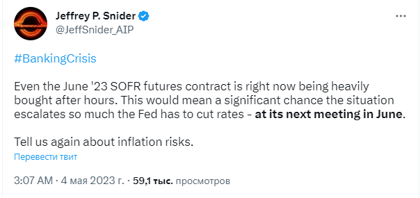 По словам Снайдера, всё указывает на значительную вероятность того, что финансовая ситуация может обостриться до такой степени, что ФРС придётся снизить процентные ставки на следующем заседании в июне 2023 года.